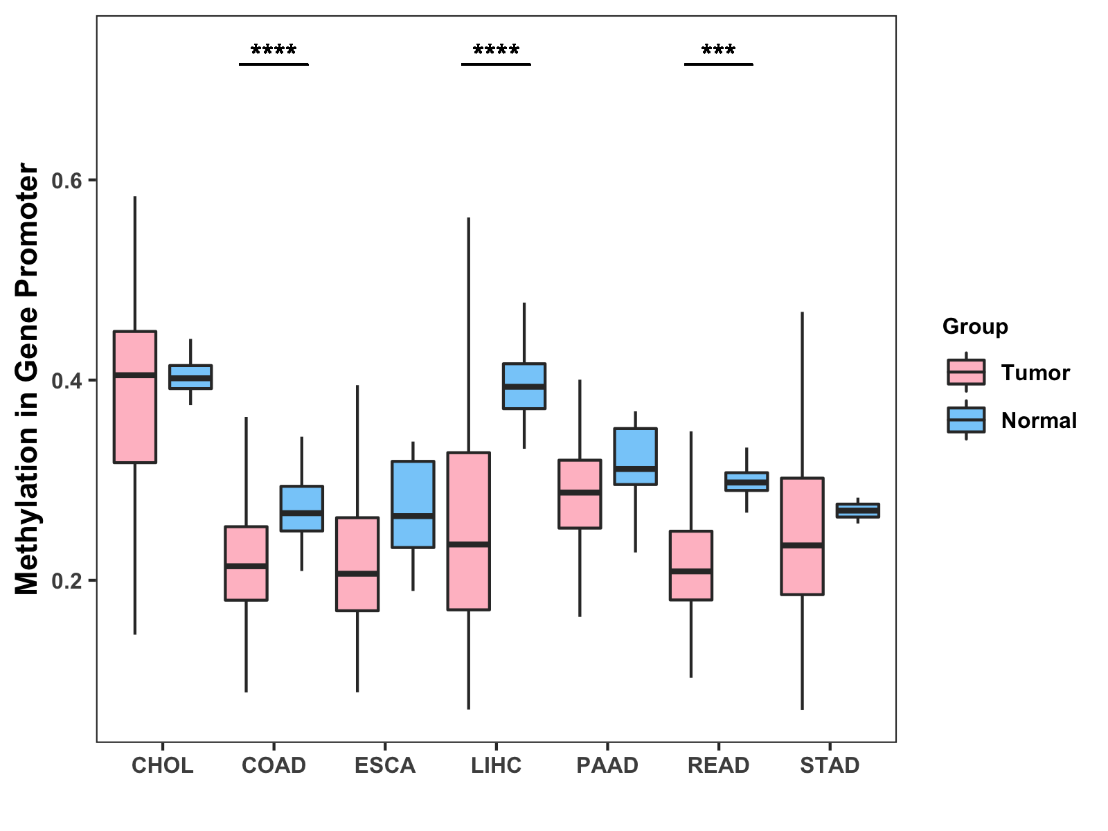 Boxplot of All Gastrointestinal Cancer ( * : 0.01-0.05 , ** : 0.005-0.01 , *** : 0.0001-0.005 , **** : < 0.0001 ) |