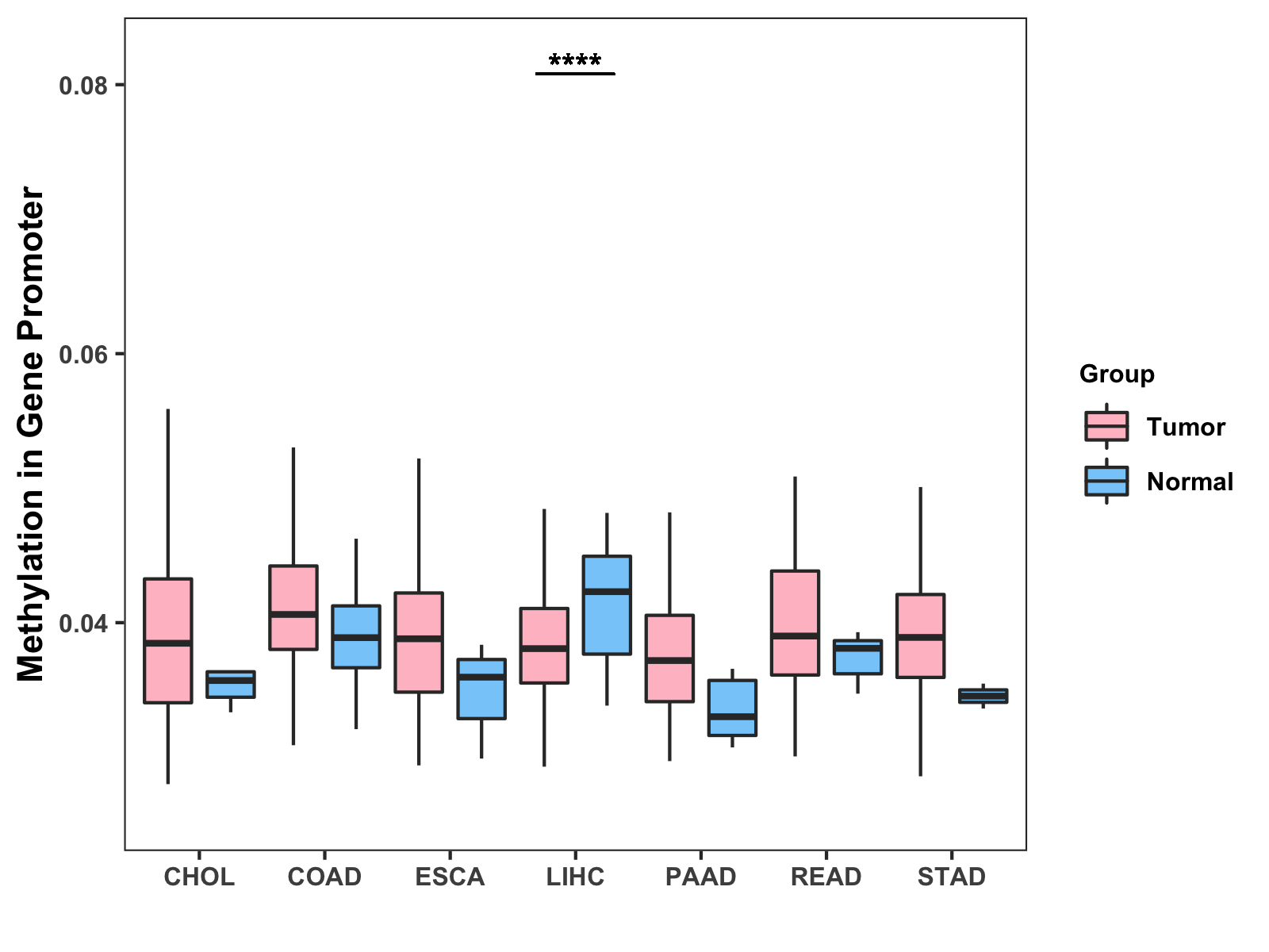 Boxplot of All Gastrointestinal Cancer ( * : 0.01-0.05 , ** : 0.005-0.01 , *** : 0.0001-0.005 , **** : < 0.0001 ) |