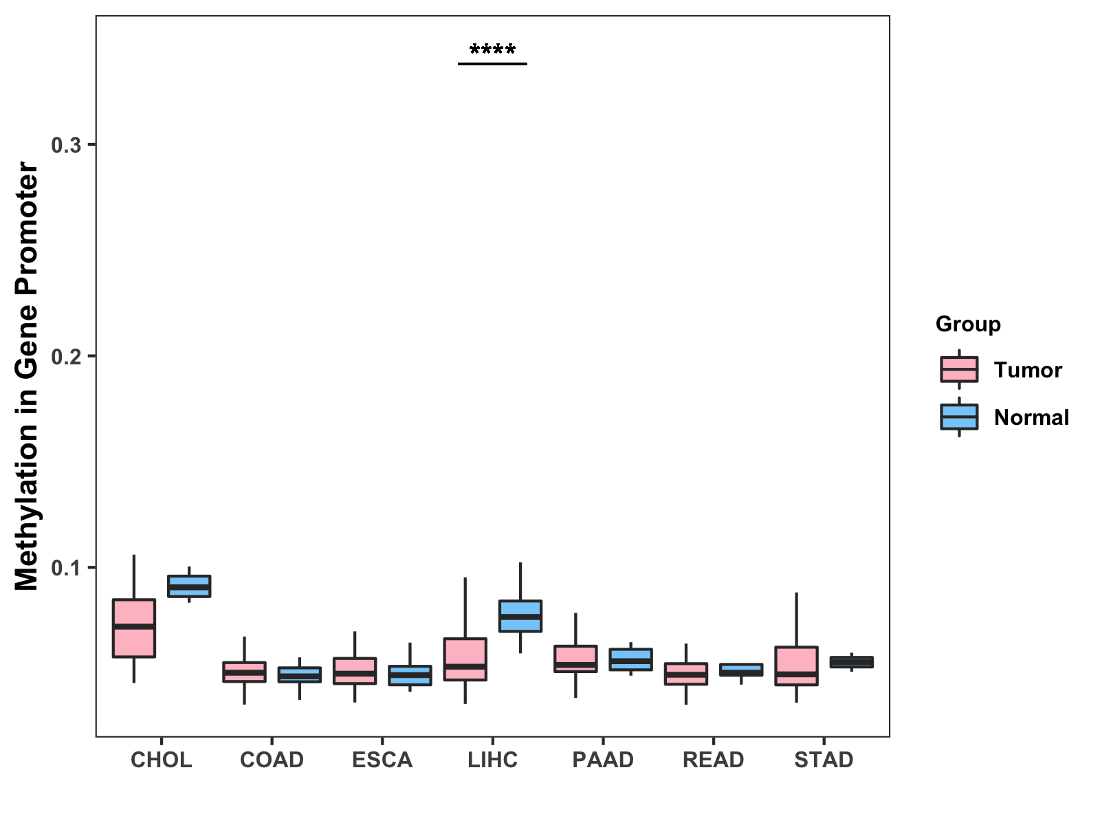 Boxplot of All Gastrointestinal Cancer ( * : 0.01-0.05 , ** : 0.005-0.01 , *** : 0.0001-0.005 , **** : < 0.0001 ) |