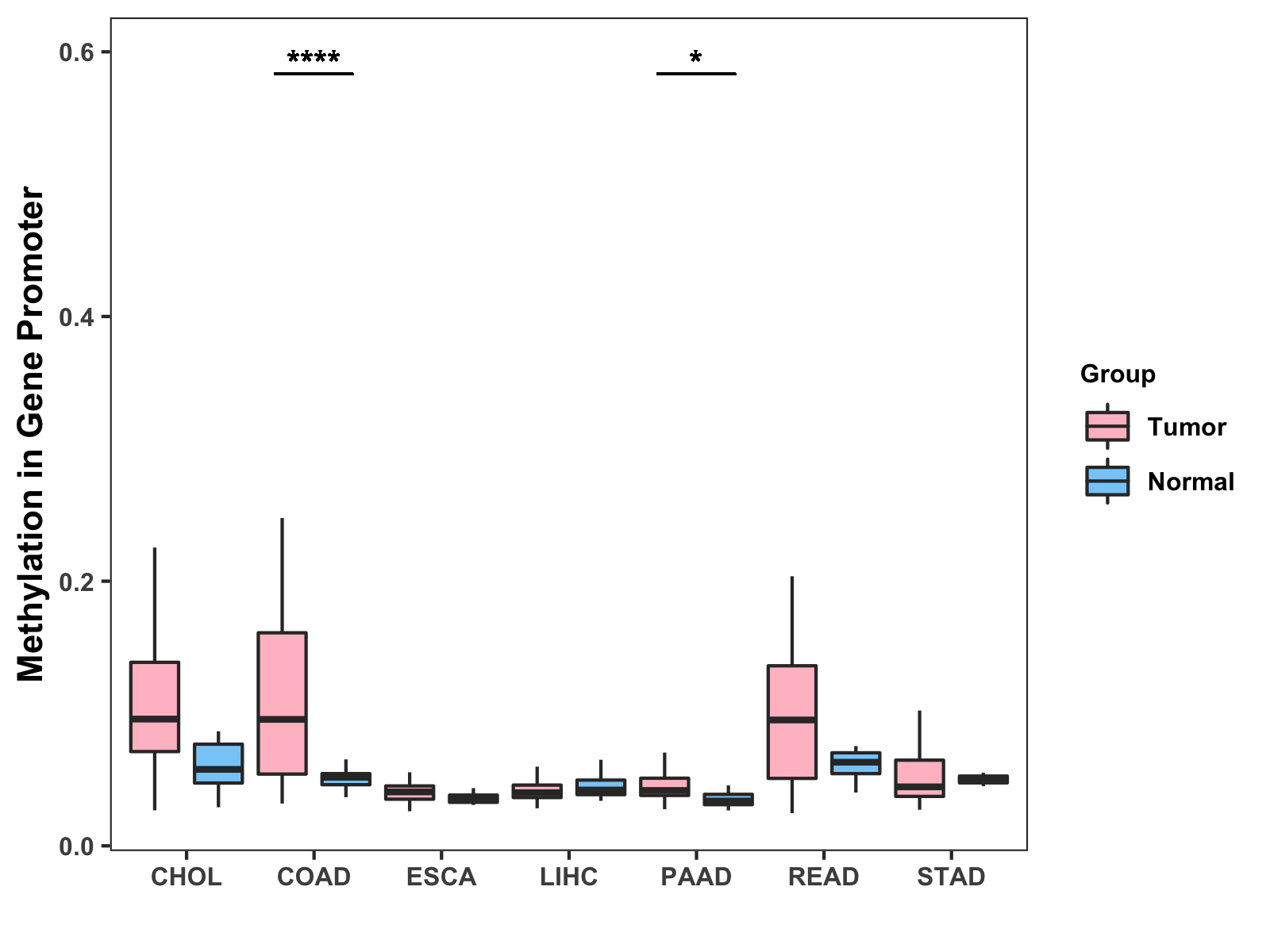 Boxplot of All Gastrointestinal Cancer ( * : 0.01-0.05 , ** : 0.005-0.01 , *** : 0.0001-0.005 , **** : < 0.0001 ) |