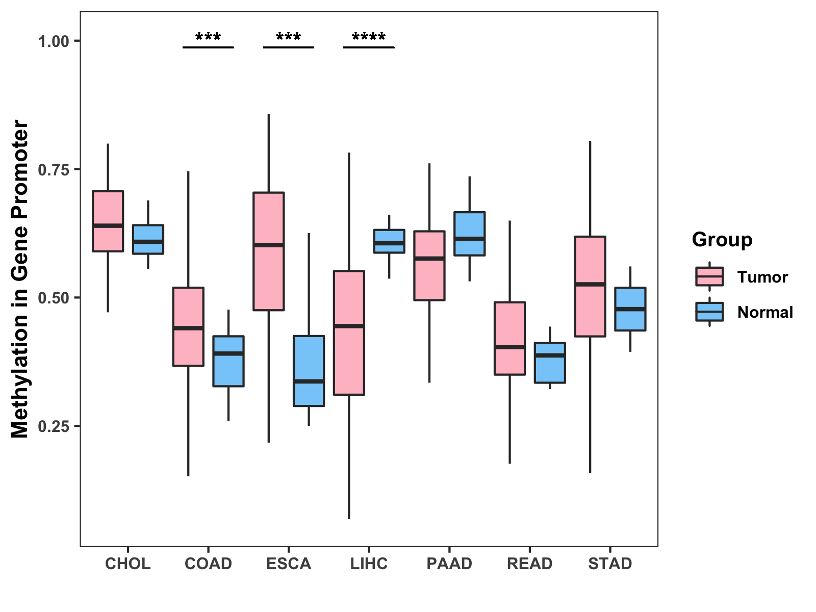 Boxplot of All Gastrointestinal Cancer ( * : 0.01-0.05 , ** : 0.005-0.01 , *** : 0.0001-0.005 , **** : < 0.0001 ) |