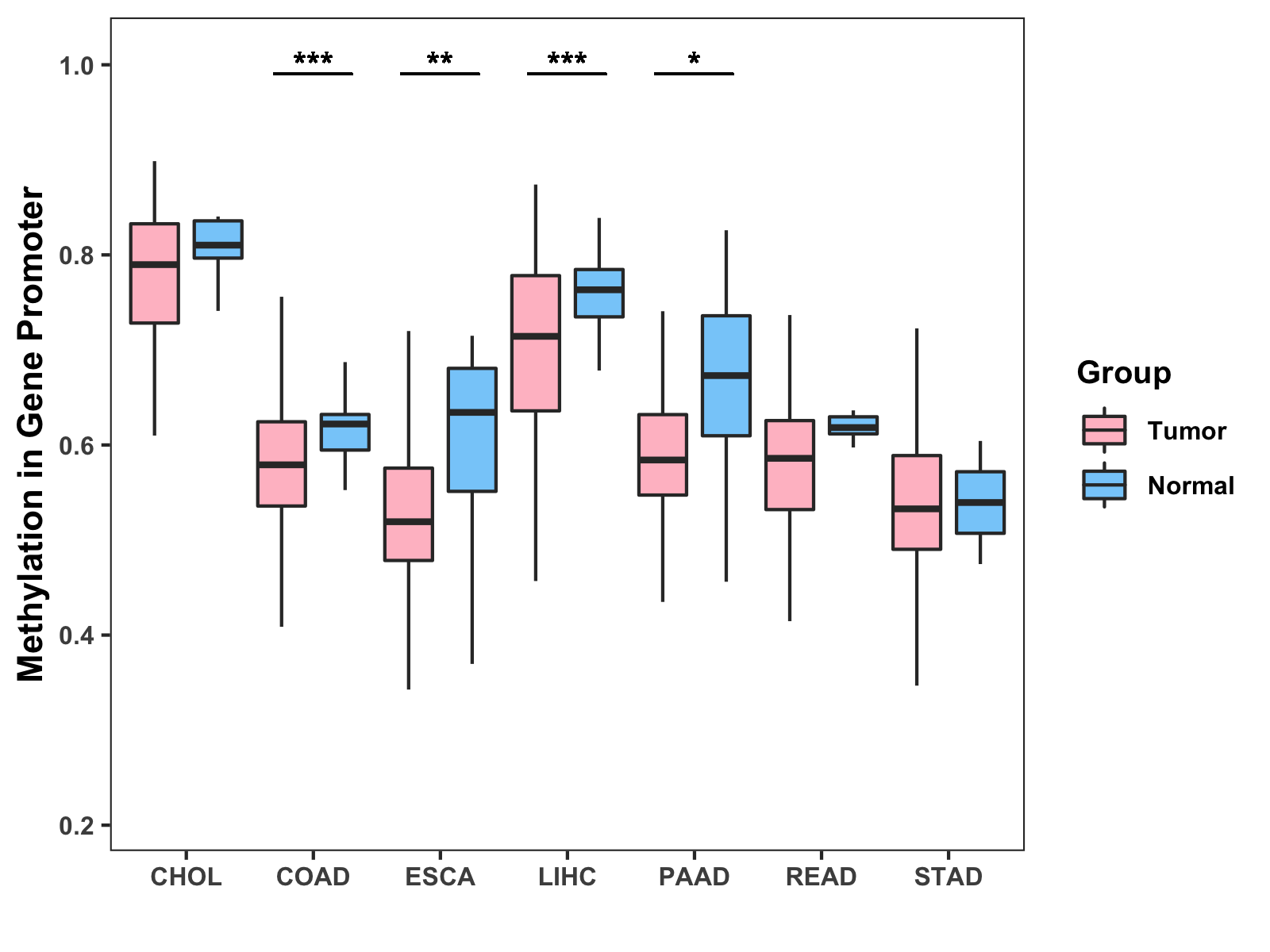 Boxplot of All Gastrointestinal Cancer ( * : 0.01-0.05 , ** : 0.005-0.01 , *** : 0.0001-0.005 , **** : < 0.0001 ) |