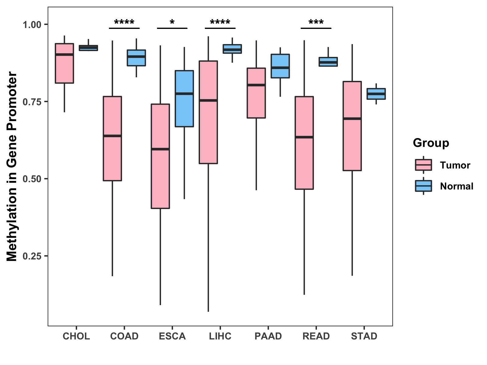 Boxplot of All Gastrointestinal Cancer ( * : 0.01-0.05 , ** : 0.005-0.01 , *** : 0.0001-0.005 , **** : < 0.0001 ) |