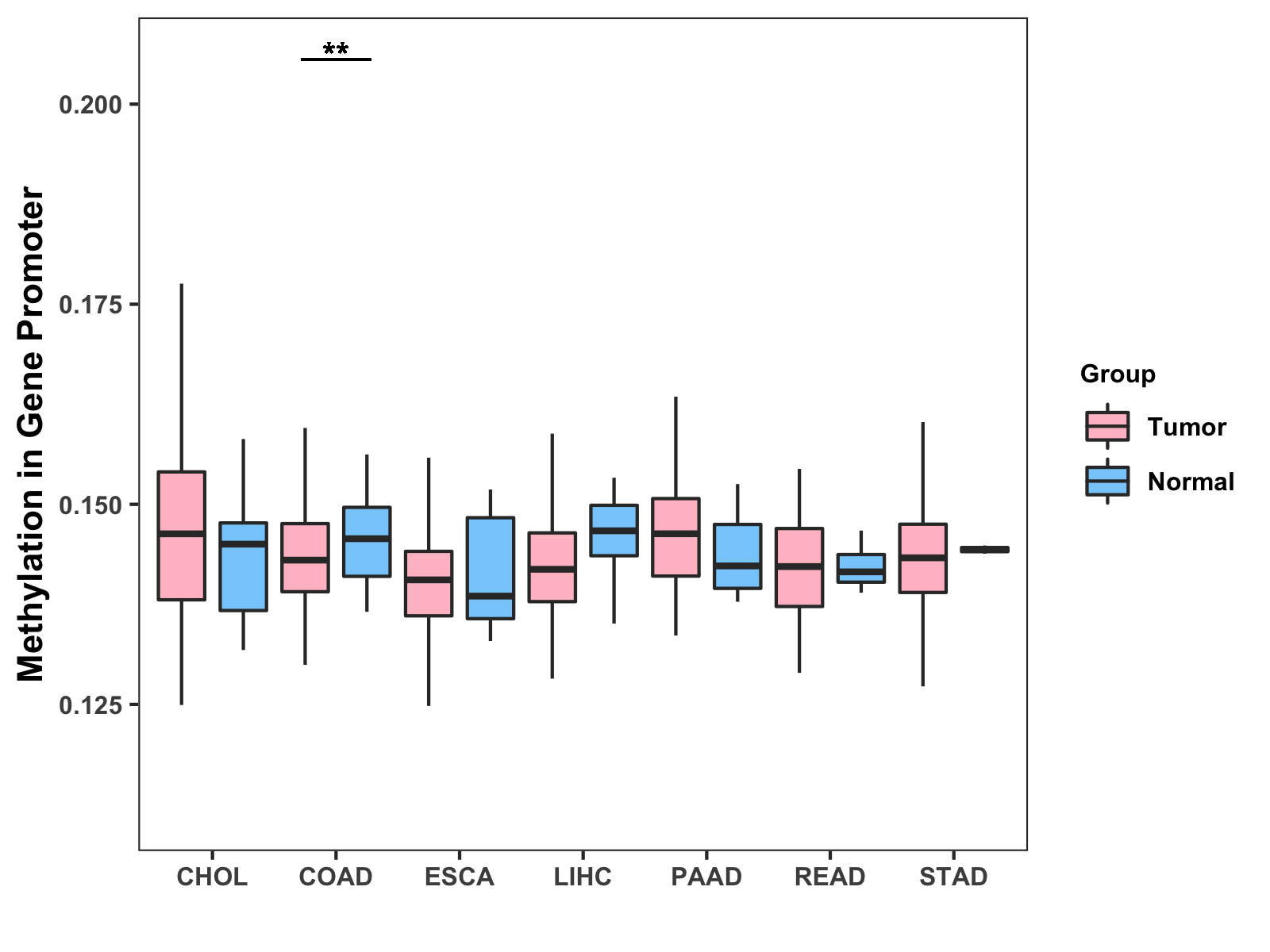 Boxplot of All Gastrointestinal Cancer ( * : 0.01-0.05 , ** : 0.005-0.01 , *** : 0.0001-0.005 , **** : < 0.0001 ) |