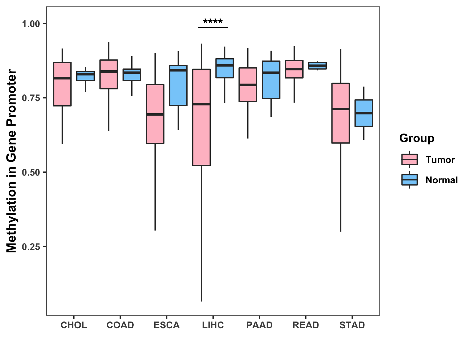 Boxplot of All Gastrointestinal Cancer ( * : 0.01-0.05 , ** : 0.005-0.01 , *** : 0.0001-0.005 , **** : < 0.0001 ) |