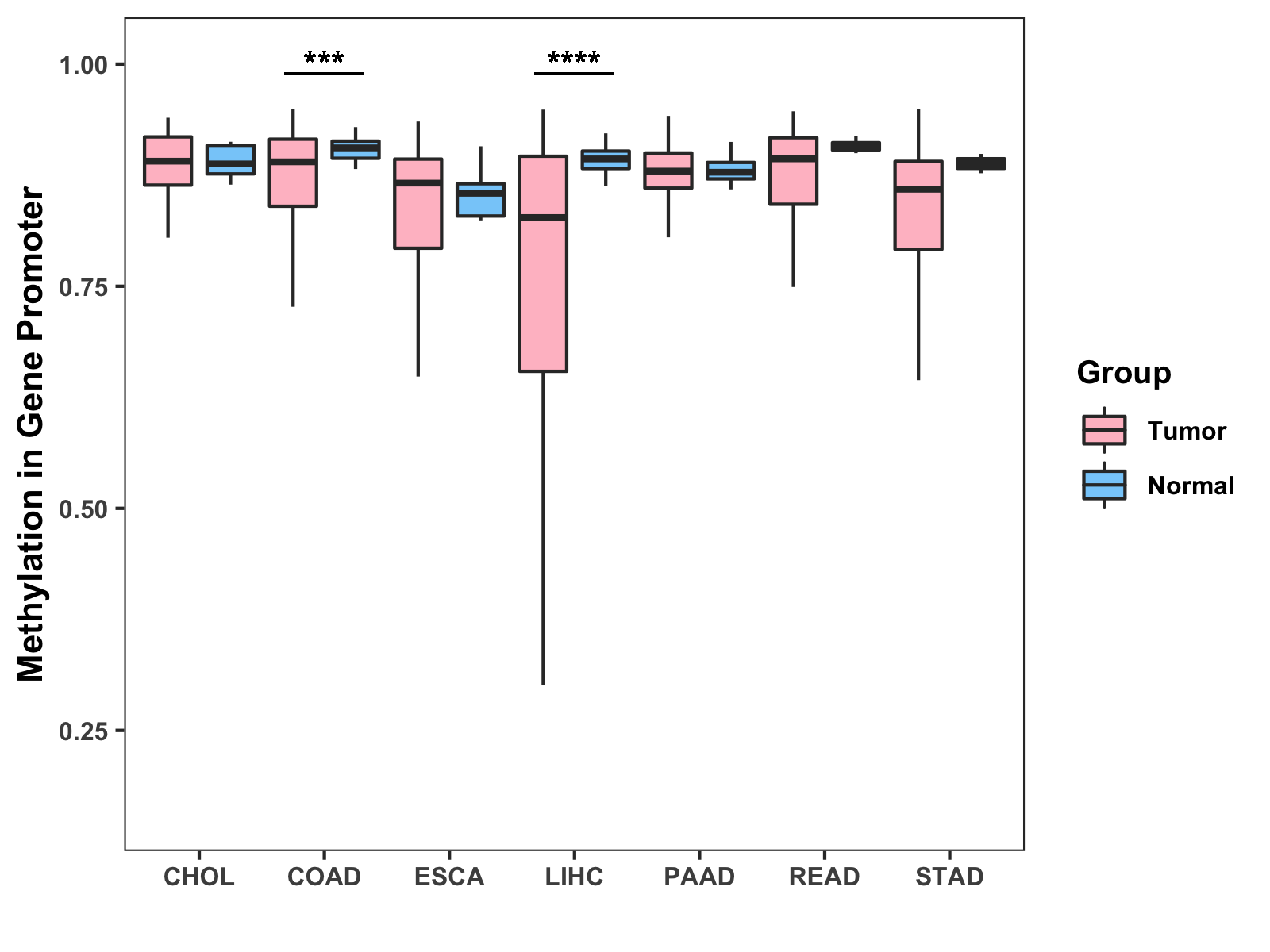 Boxplot of All Gastrointestinal Cancer ( * : 0.01-0.05 , ** : 0.005-0.01 , *** : 0.0001-0.005 , **** : < 0.0001 ) |