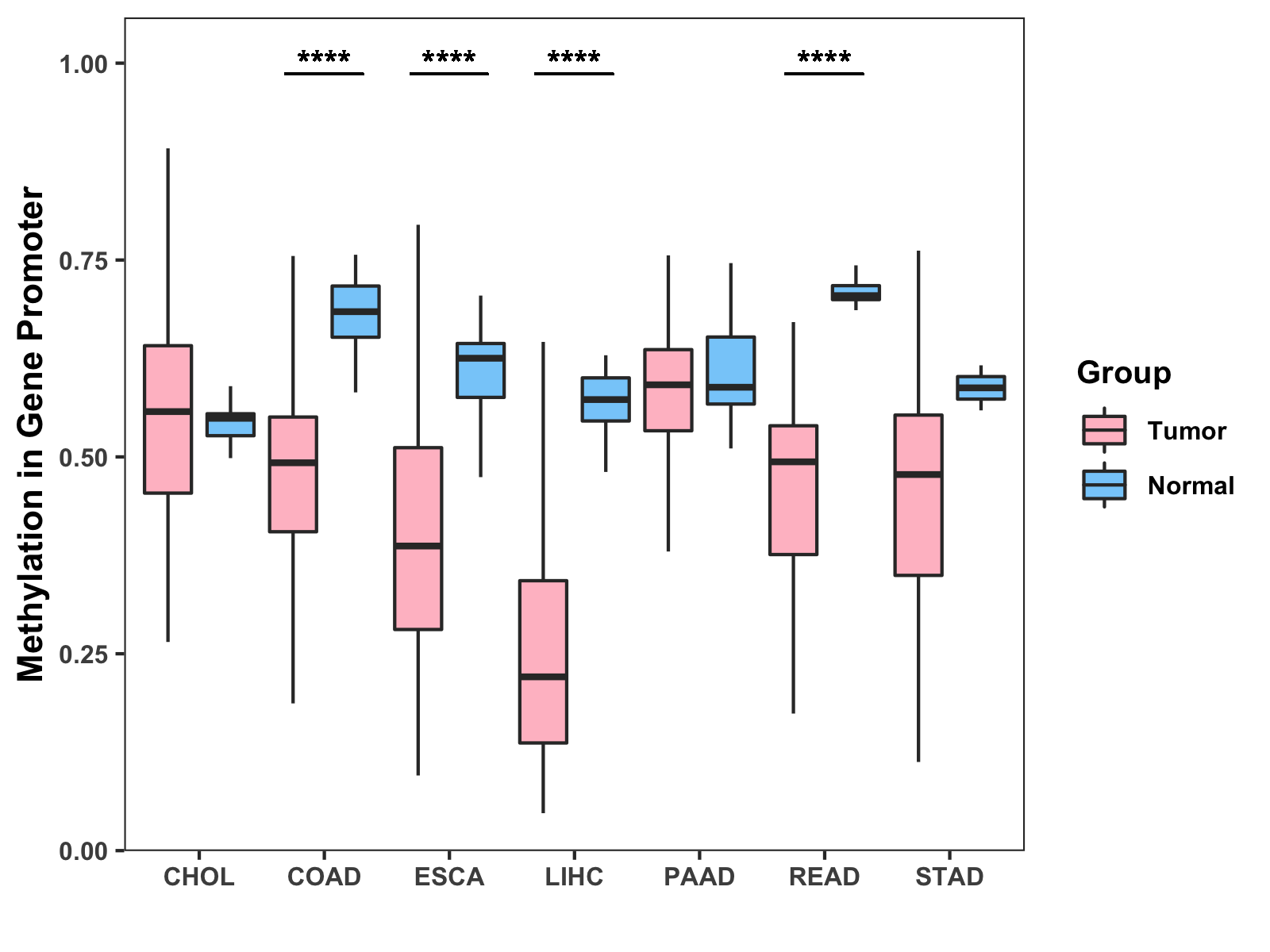 Boxplot of All Gastrointestinal Cancer ( * : 0.01-0.05 , ** : 0.005-0.01 , *** : 0.0001-0.005 , **** : < 0.0001 ) |