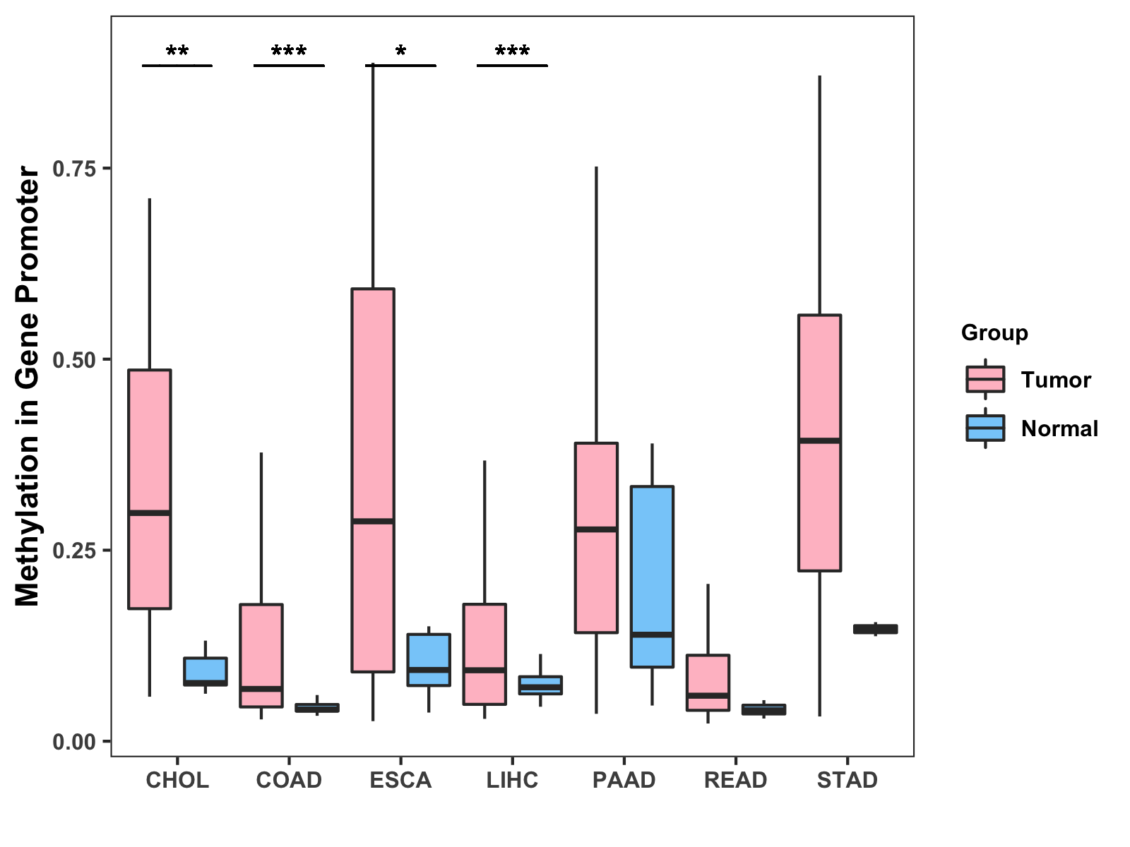 Boxplot of All Gastrointestinal Cancer ( * : 0.01-0.05 , ** : 0.005-0.01 , *** : 0.0001-0.005 , **** : < 0.0001 ) |