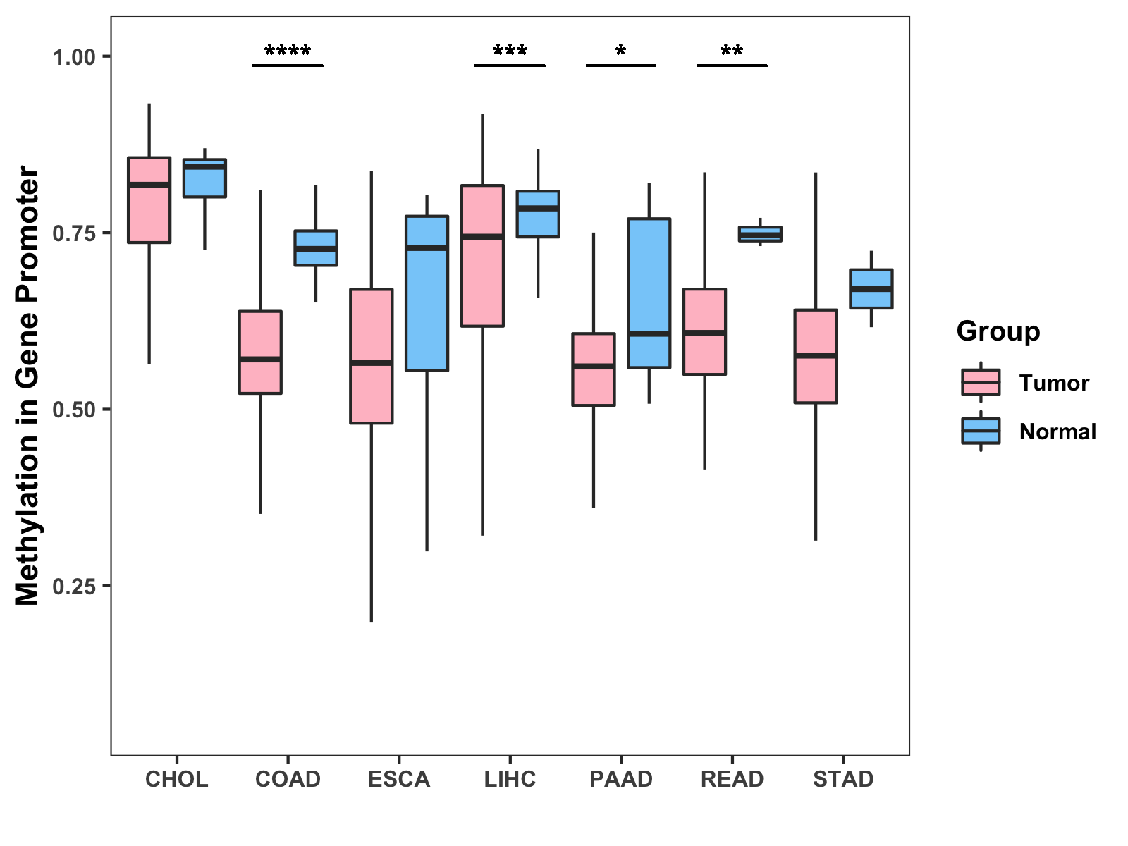 Boxplot of All Gastrointestinal Cancer ( * : 0.01-0.05 , ** : 0.005-0.01 , *** : 0.0001-0.005 , **** : < 0.0001 ) |