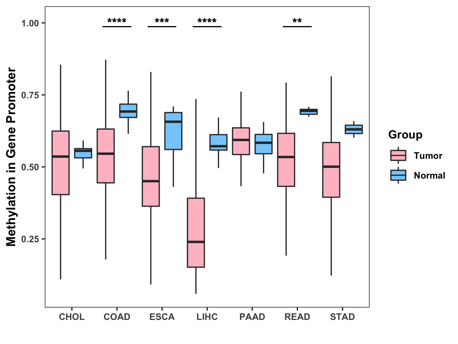 Boxplot of All Gastrointestinal Cancer ( * : 0.01-0.05 , ** : 0.005-0.01 , *** : 0.0001-0.005 , **** : < 0.0001 ) |