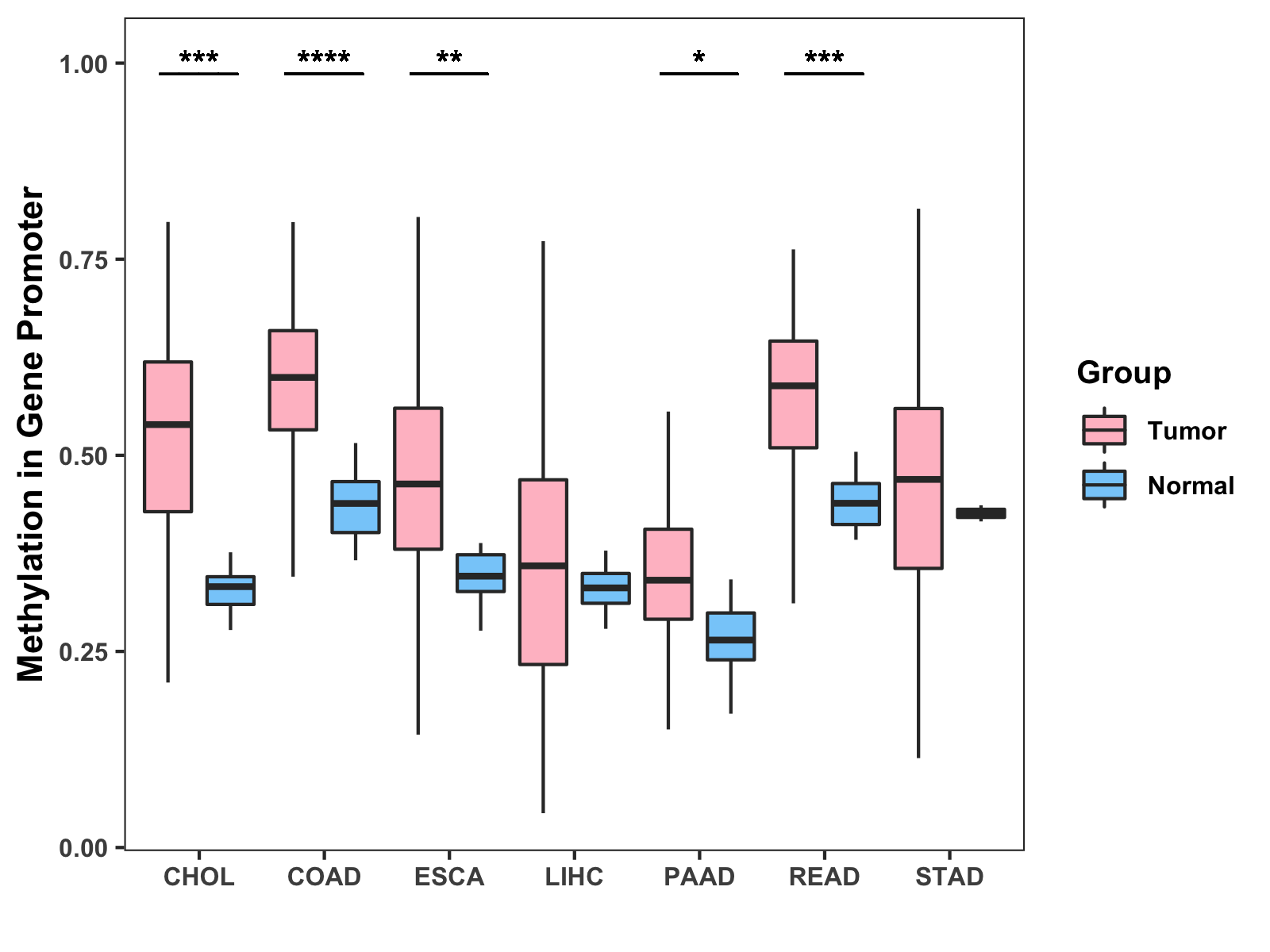 Boxplot of All Gastrointestinal Cancer ( * : 0.01-0.05 , ** : 0.005-0.01 , *** : 0.0001-0.005 , **** : < 0.0001 ) |