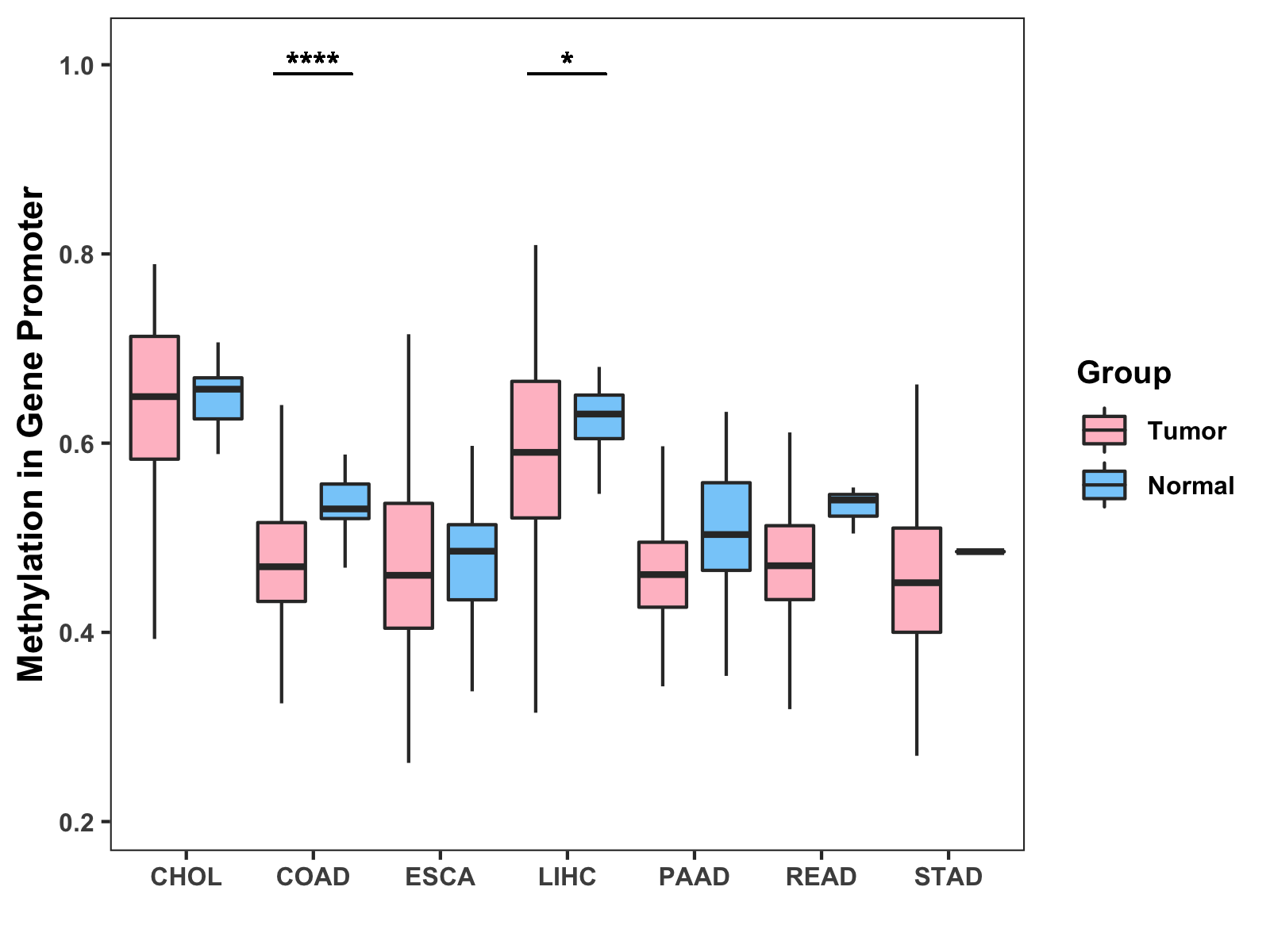 Boxplot of All Gastrointestinal Cancer ( * : 0.01-0.05 , ** : 0.005-0.01 , *** : 0.0001-0.005 , **** : < 0.0001 ) |
