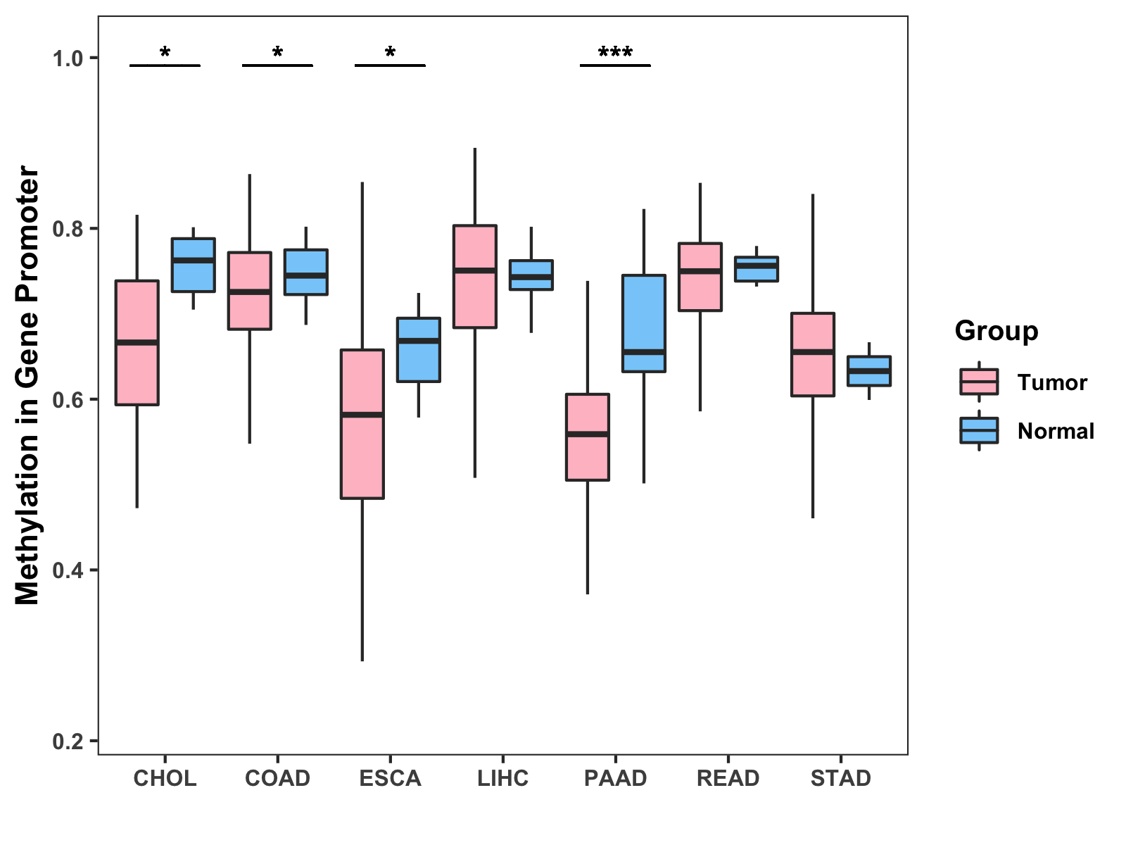 Boxplot of All Gastrointestinal Cancer ( * : 0.01-0.05 , ** : 0.005-0.01 , *** : 0.0001-0.005 , **** : < 0.0001 ) |