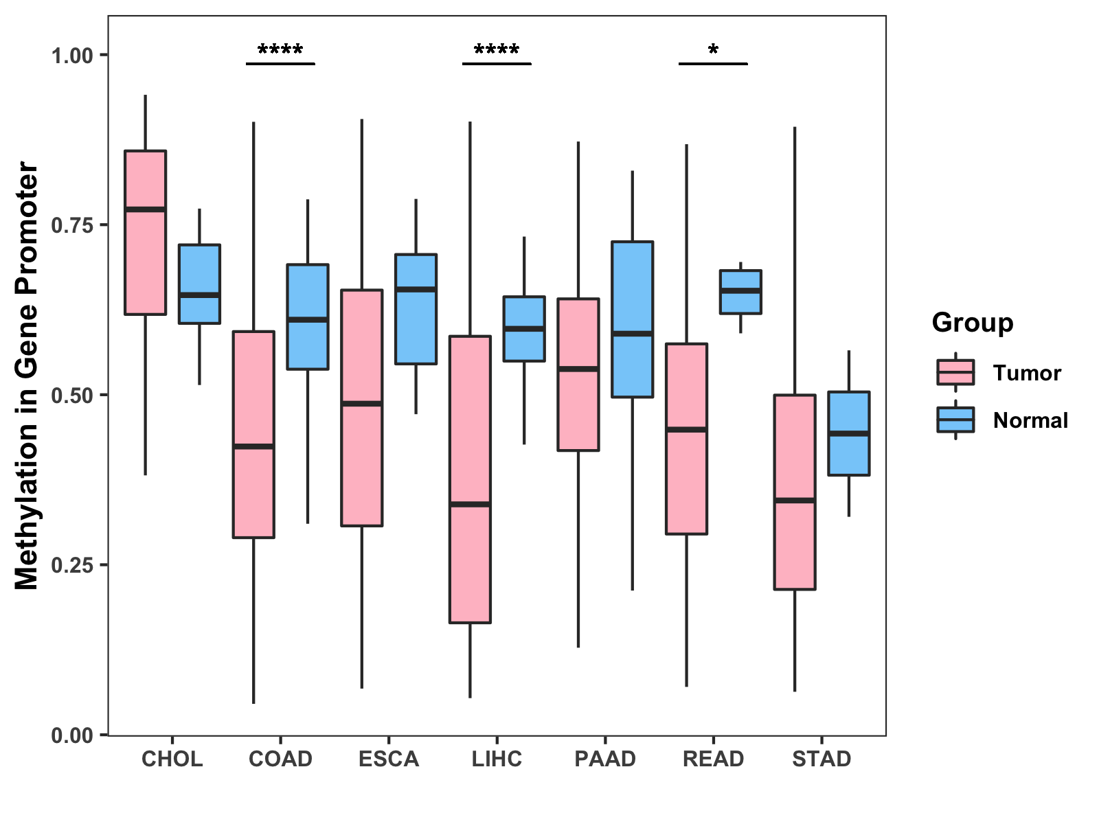 Boxplot of All Gastrointestinal Cancer ( * : 0.01-0.05 , ** : 0.005-0.01 , *** : 0.0001-0.005 , **** : < 0.0001 ) |