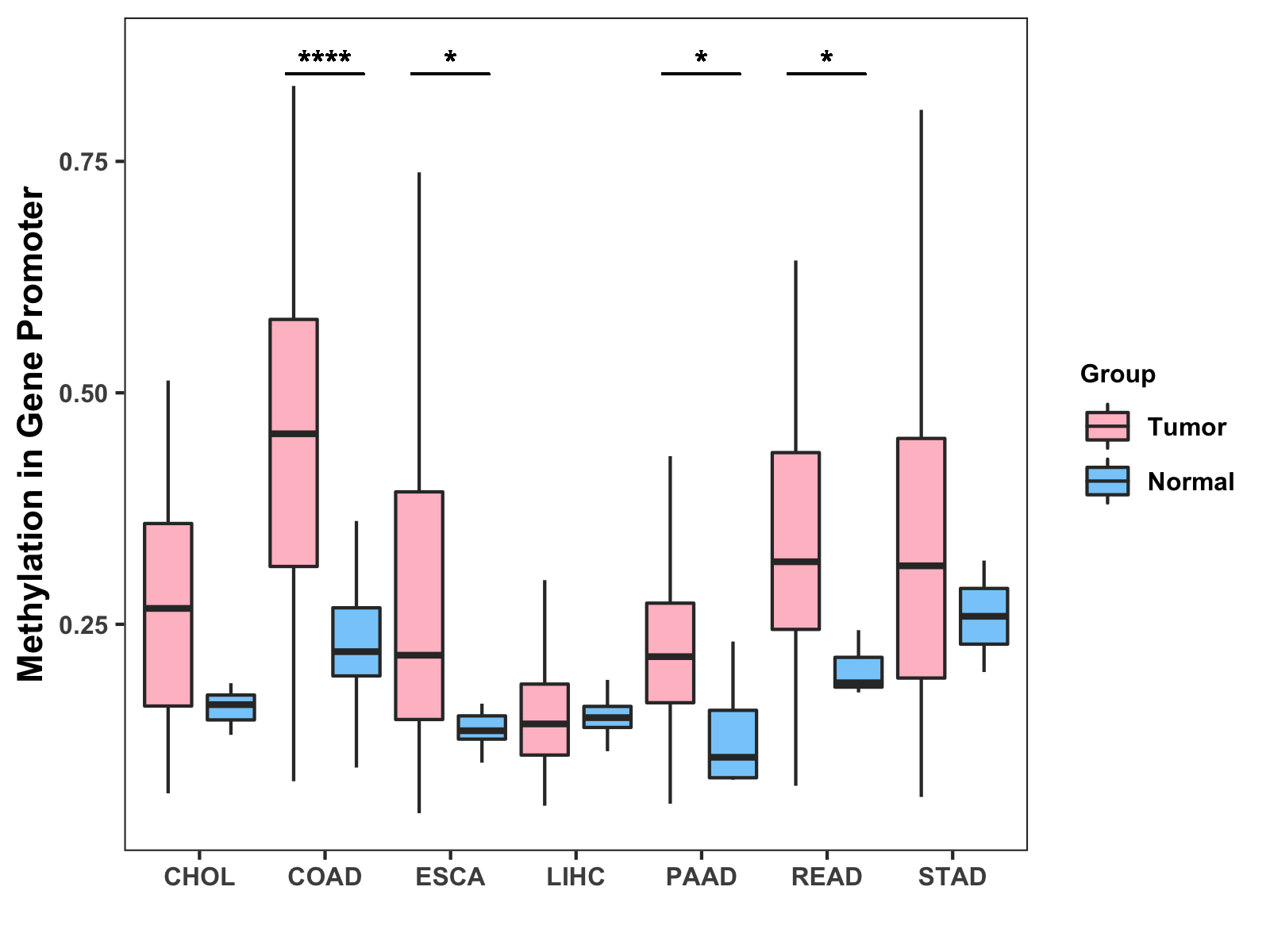 Boxplot of All Gastrointestinal Cancer ( * : 0.01-0.05 , ** : 0.005-0.01 , *** : 0.0001-0.005 , **** : < 0.0001 ) |
