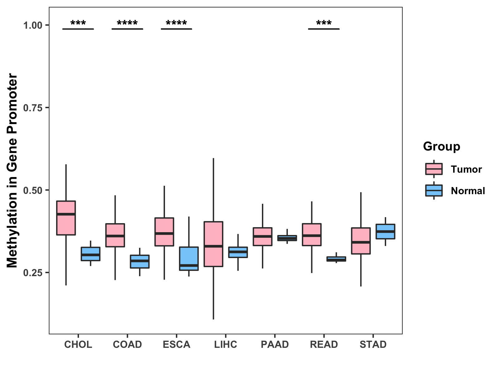 Boxplot of All Gastrointestinal Cancer ( * : 0.01-0.05 , ** : 0.005-0.01 , *** : 0.0001-0.005 , **** : < 0.0001 ) |