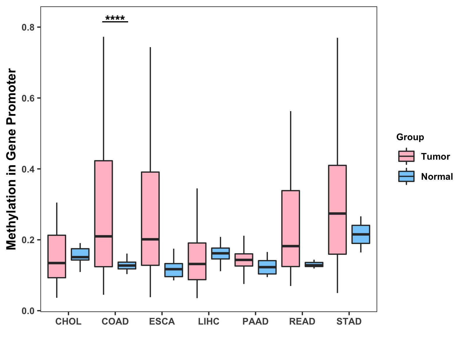 Boxplot of All Gastrointestinal Cancer ( * : 0.01-0.05 , ** : 0.005-0.01 , *** : 0.0001-0.005 , **** : < 0.0001 ) |