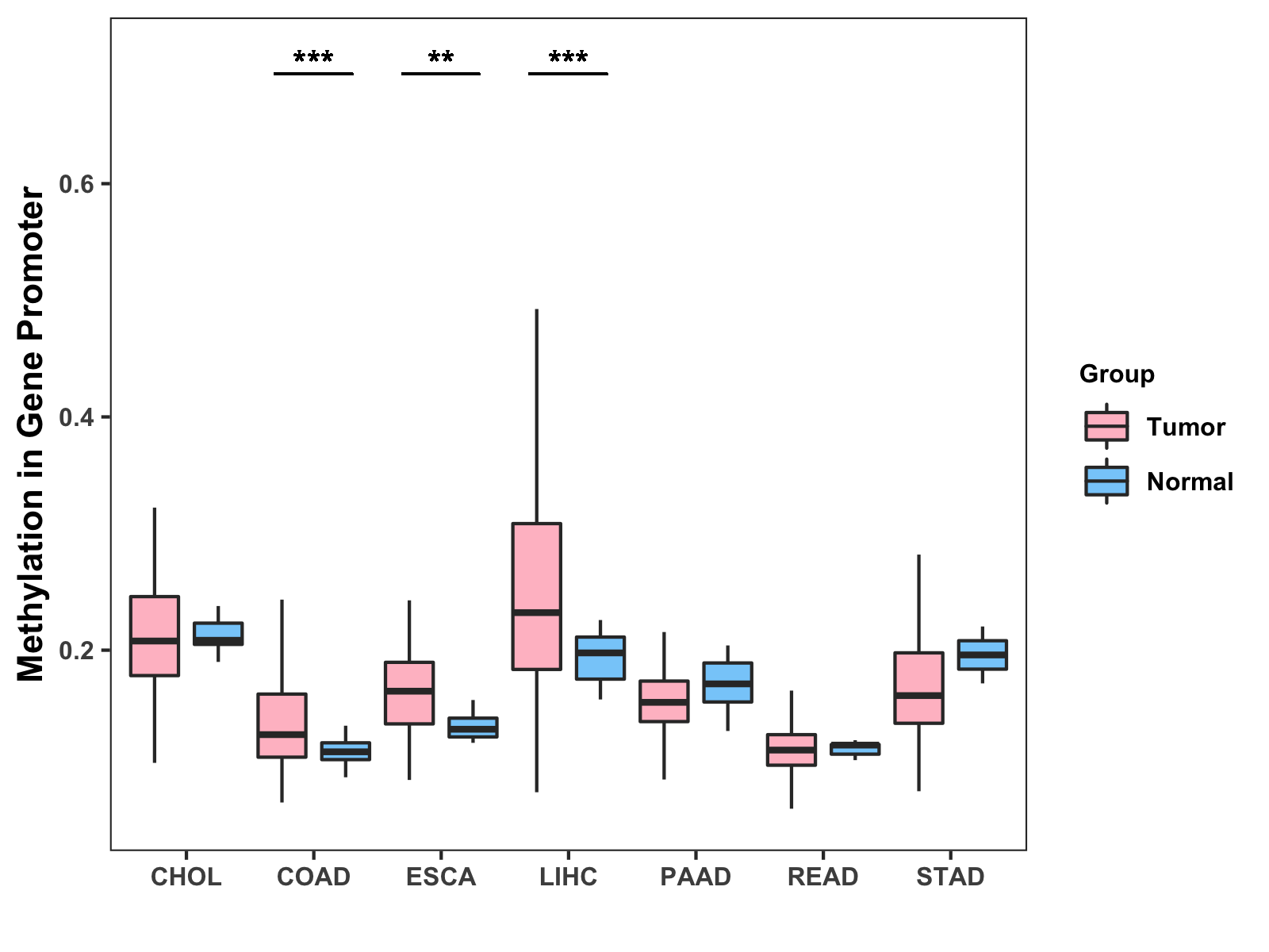 Boxplot of All Gastrointestinal Cancer ( * : 0.01-0.05 , ** : 0.005-0.01 , *** : 0.0001-0.005 , **** : < 0.0001 ) |
