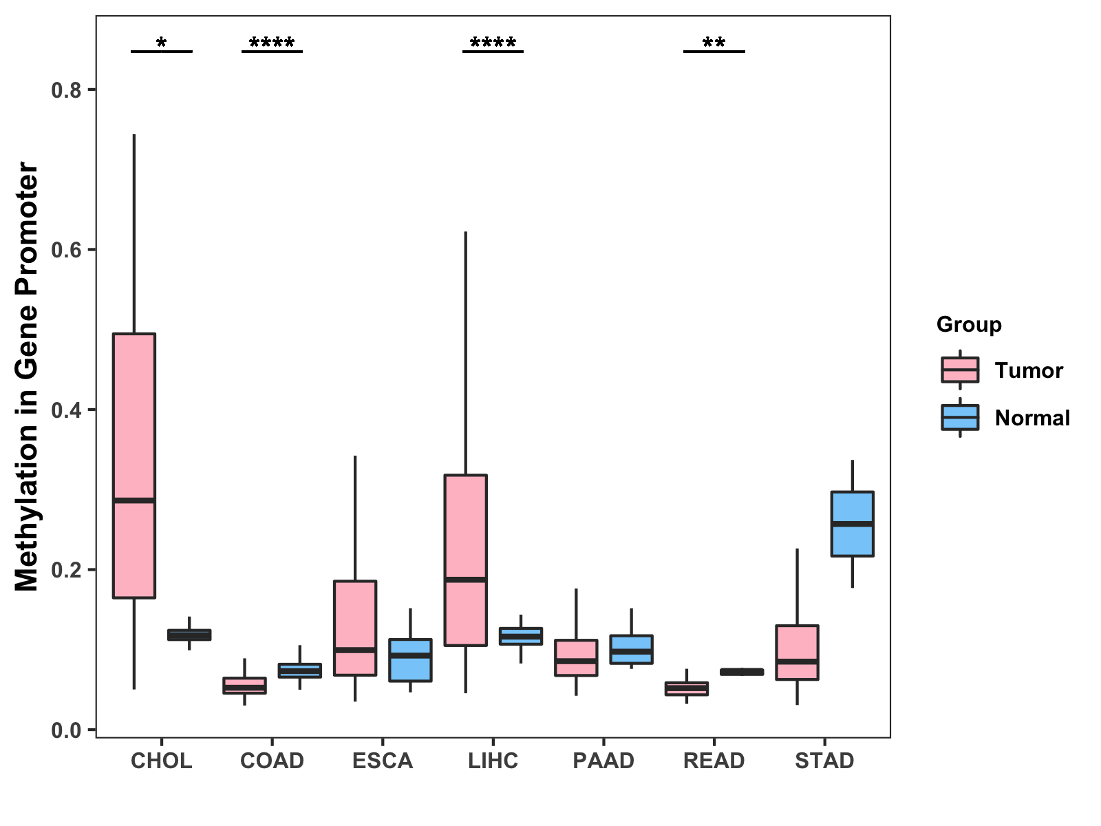 Boxplot of All Gastrointestinal Cancer ( * : 0.01-0.05 , ** : 0.005-0.01 , *** : 0.0001-0.005 , **** : < 0.0001 ) |