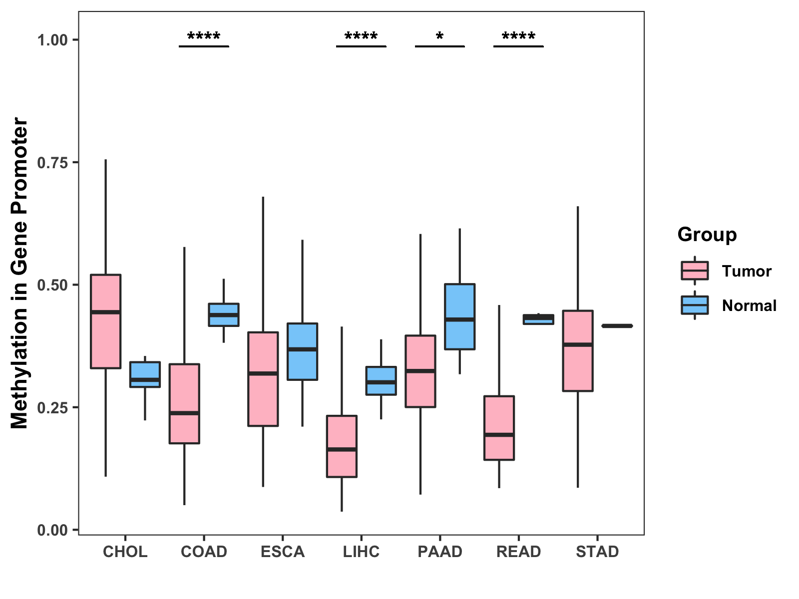 Boxplot of All Gastrointestinal Cancer ( * : 0.01-0.05 , ** : 0.005-0.01 , *** : 0.0001-0.005 , **** : < 0.0001 ) |