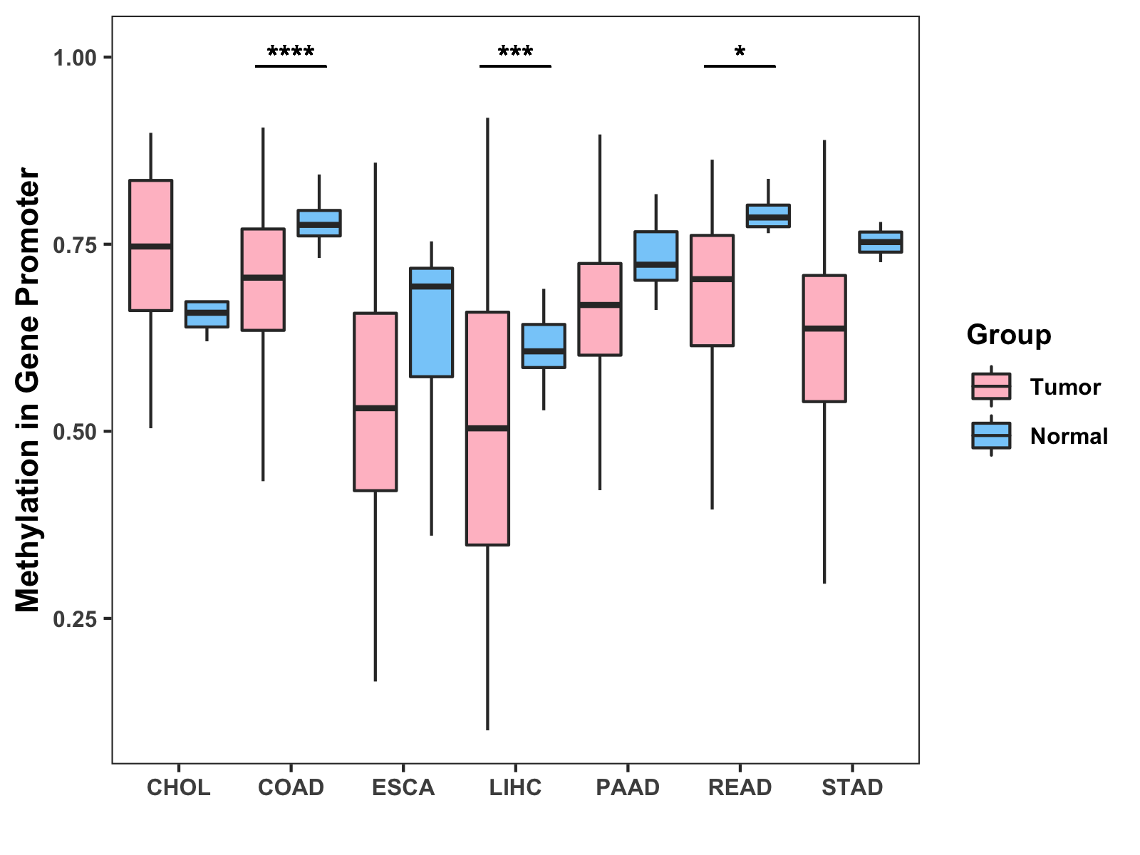 Boxplot of All Gastrointestinal Cancer ( * : 0.01-0.05 , ** : 0.005-0.01 , *** : 0.0001-0.005 , **** : < 0.0001 ) |