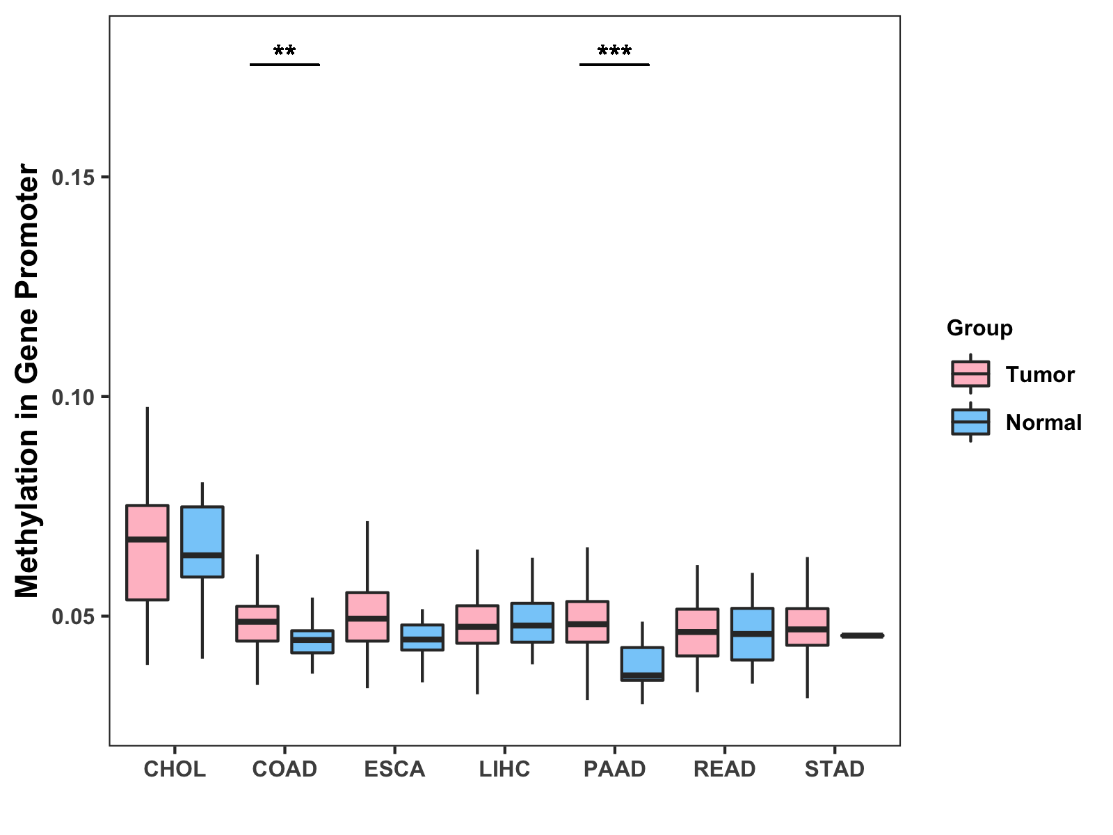 Boxplot of All Gastrointestinal Cancer ( * : 0.01-0.05 , ** : 0.005-0.01 , *** : 0.0001-0.005 , **** : < 0.0001 ) |