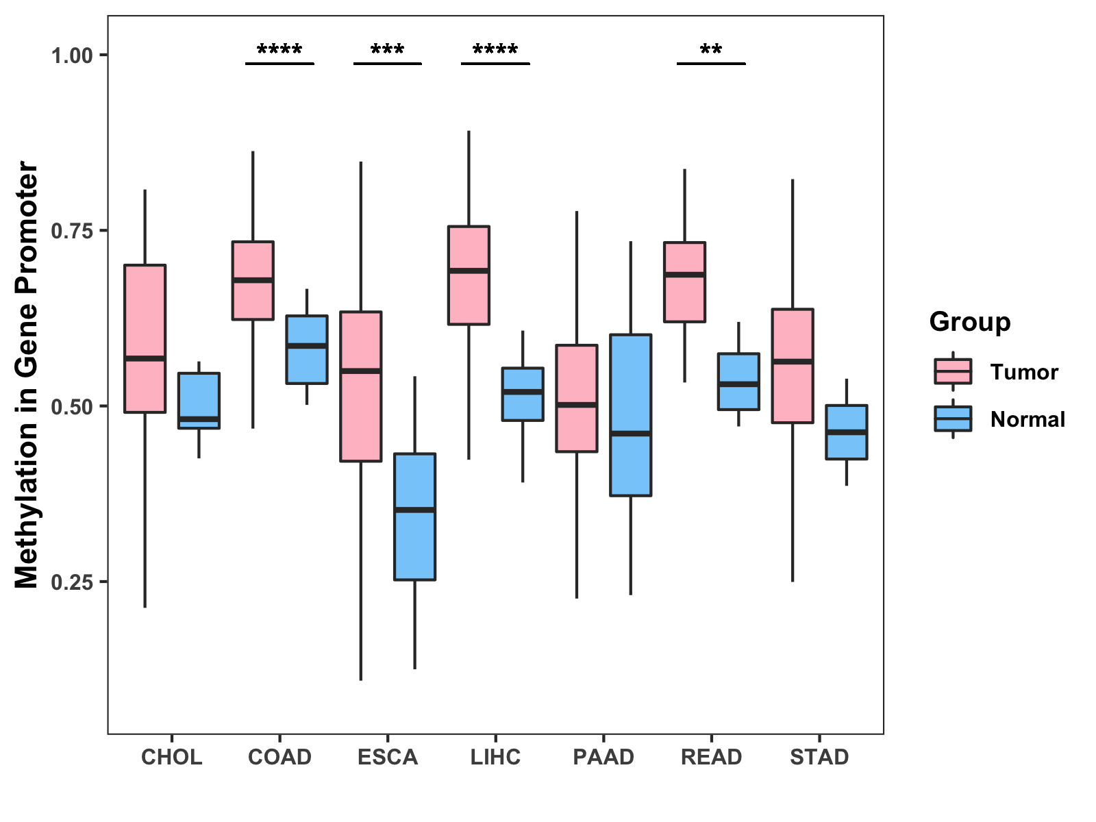 Boxplot of All Gastrointestinal Cancer ( * : 0.01-0.05 , ** : 0.005-0.01 , *** : 0.0001-0.005 , **** : < 0.0001 ) |