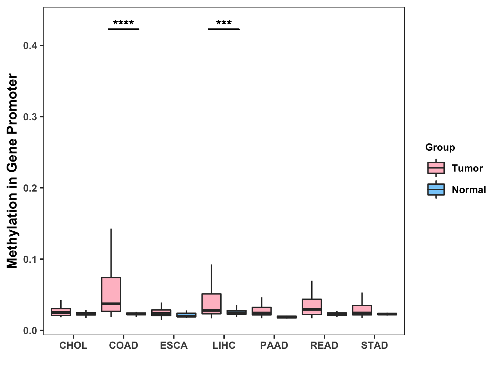 Boxplot of All Gastrointestinal Cancer ( * : 0.01-0.05 , ** : 0.005-0.01 , *** : 0.0001-0.005 , **** : < 0.0001 ) |