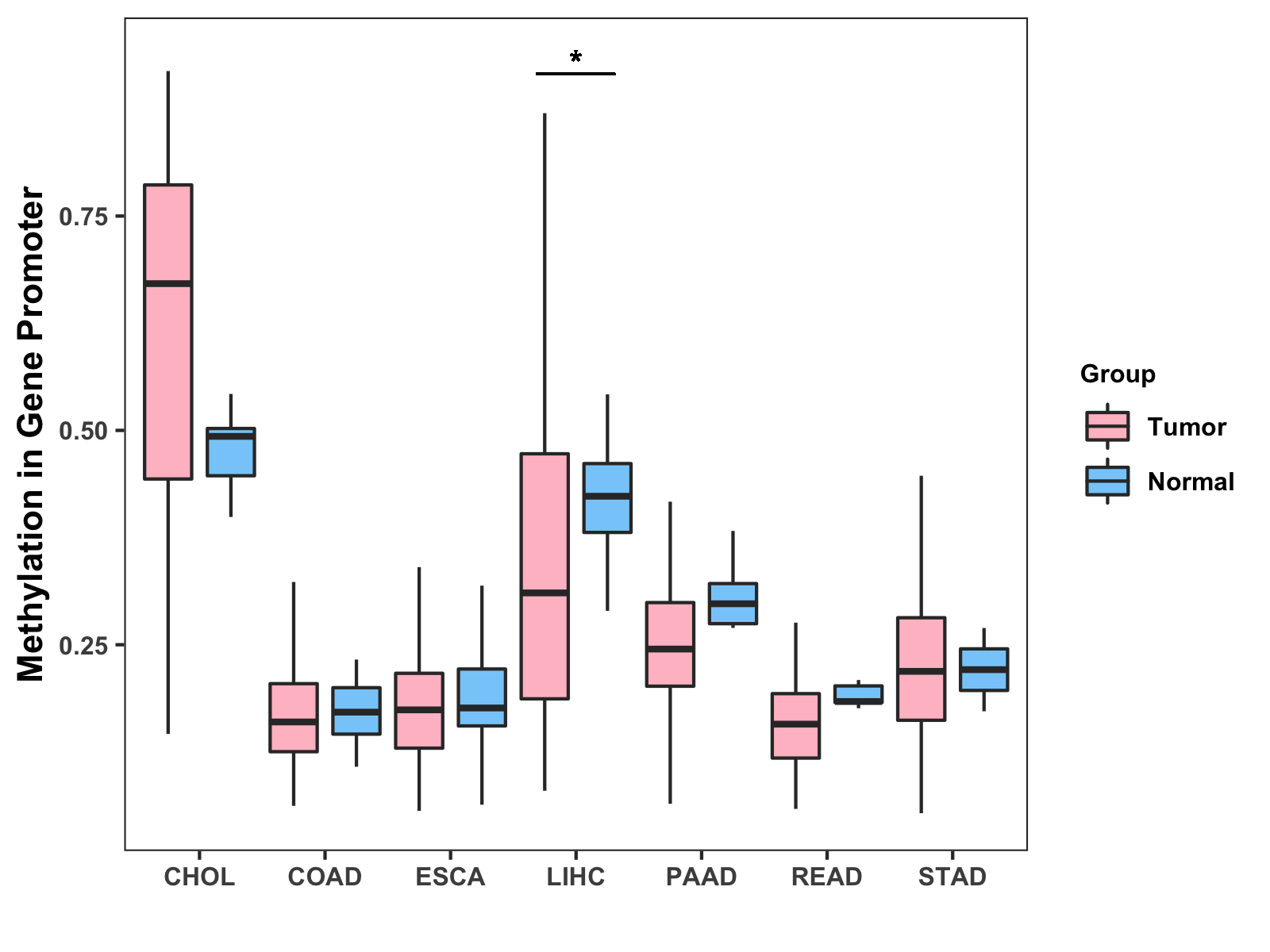 Boxplot of All Gastrointestinal Cancer ( * : 0.01-0.05 , ** : 0.005-0.01 , *** : 0.0001-0.005 , **** : < 0.0001 ) |