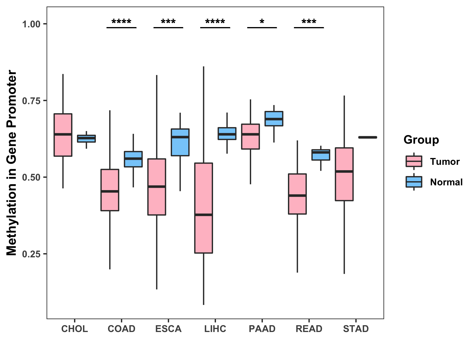 Boxplot of All Gastrointestinal Cancer ( * : 0.01-0.05 , ** : 0.005-0.01 , *** : 0.0001-0.005 , **** : < 0.0001 ) |