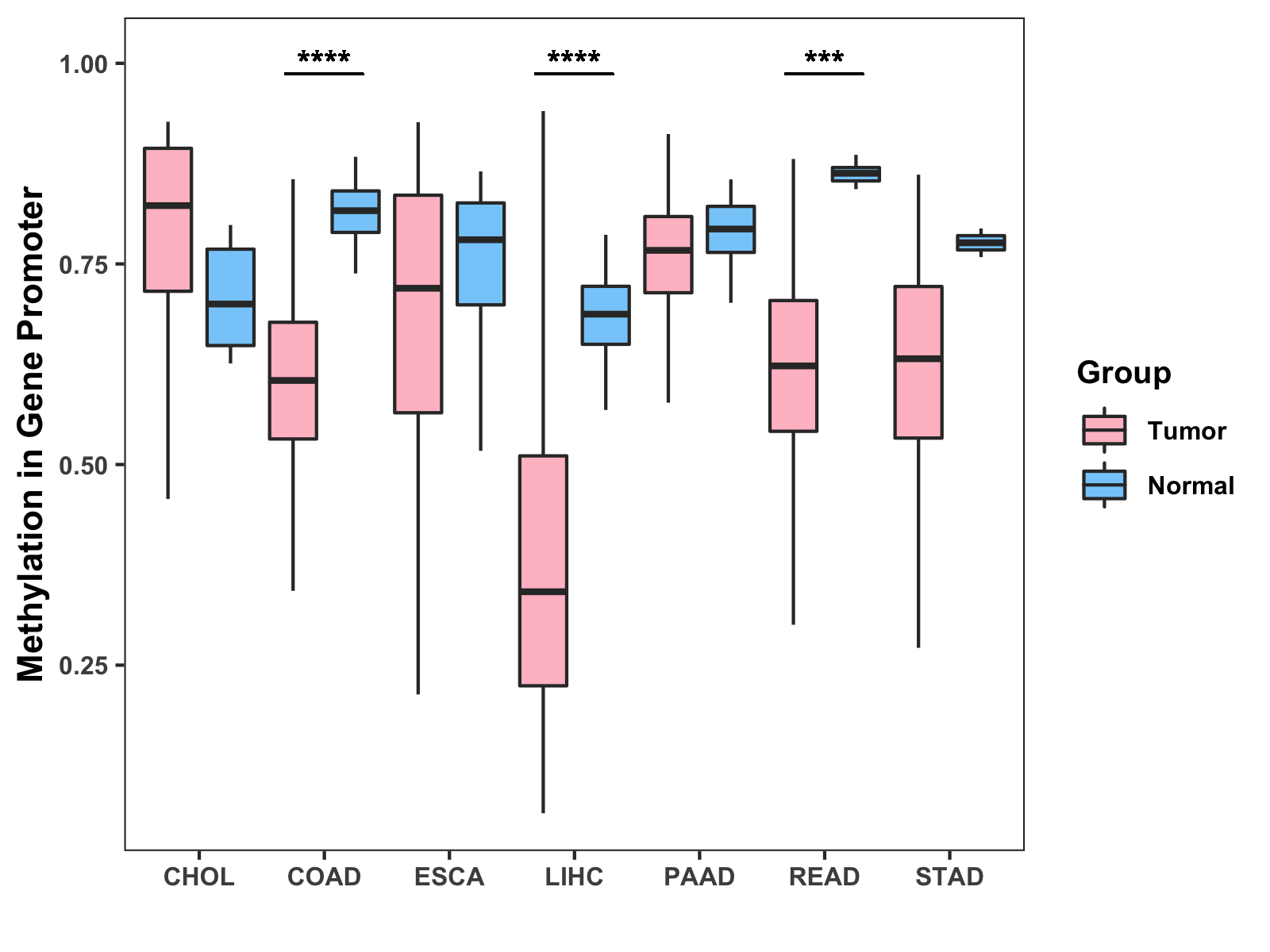 Boxplot of All Gastrointestinal Cancer ( * : 0.01-0.05 , ** : 0.005-0.01 , *** : 0.0001-0.005 , **** : < 0.0001 ) |