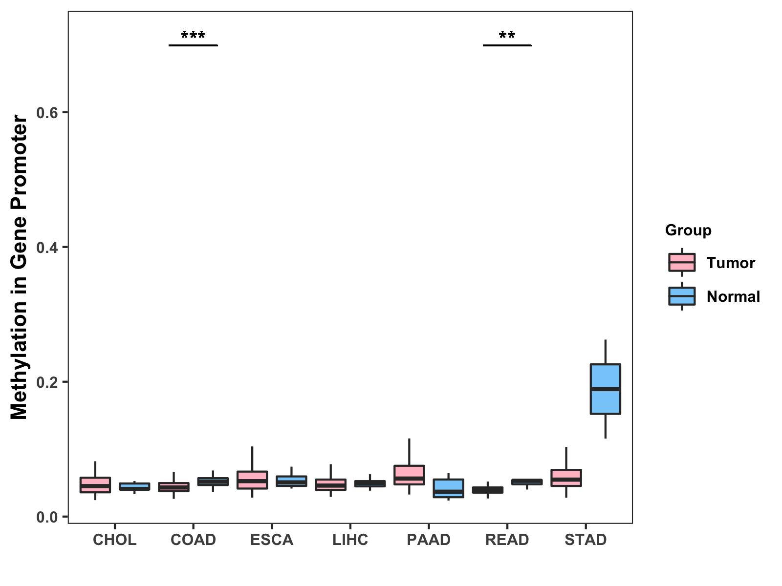 Boxplot of All Gastrointestinal Cancer ( * : 0.01-0.05 , ** : 0.005-0.01 , *** : 0.0001-0.005 , **** : < 0.0001 ) |