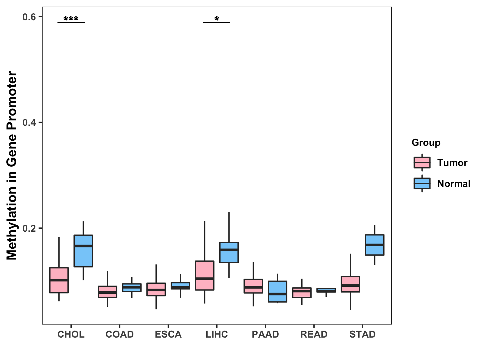 Boxplot of All Gastrointestinal Cancer ( * : 0.01-0.05 , ** : 0.005-0.01 , *** : 0.0001-0.005 , **** : < 0.0001 ) |
