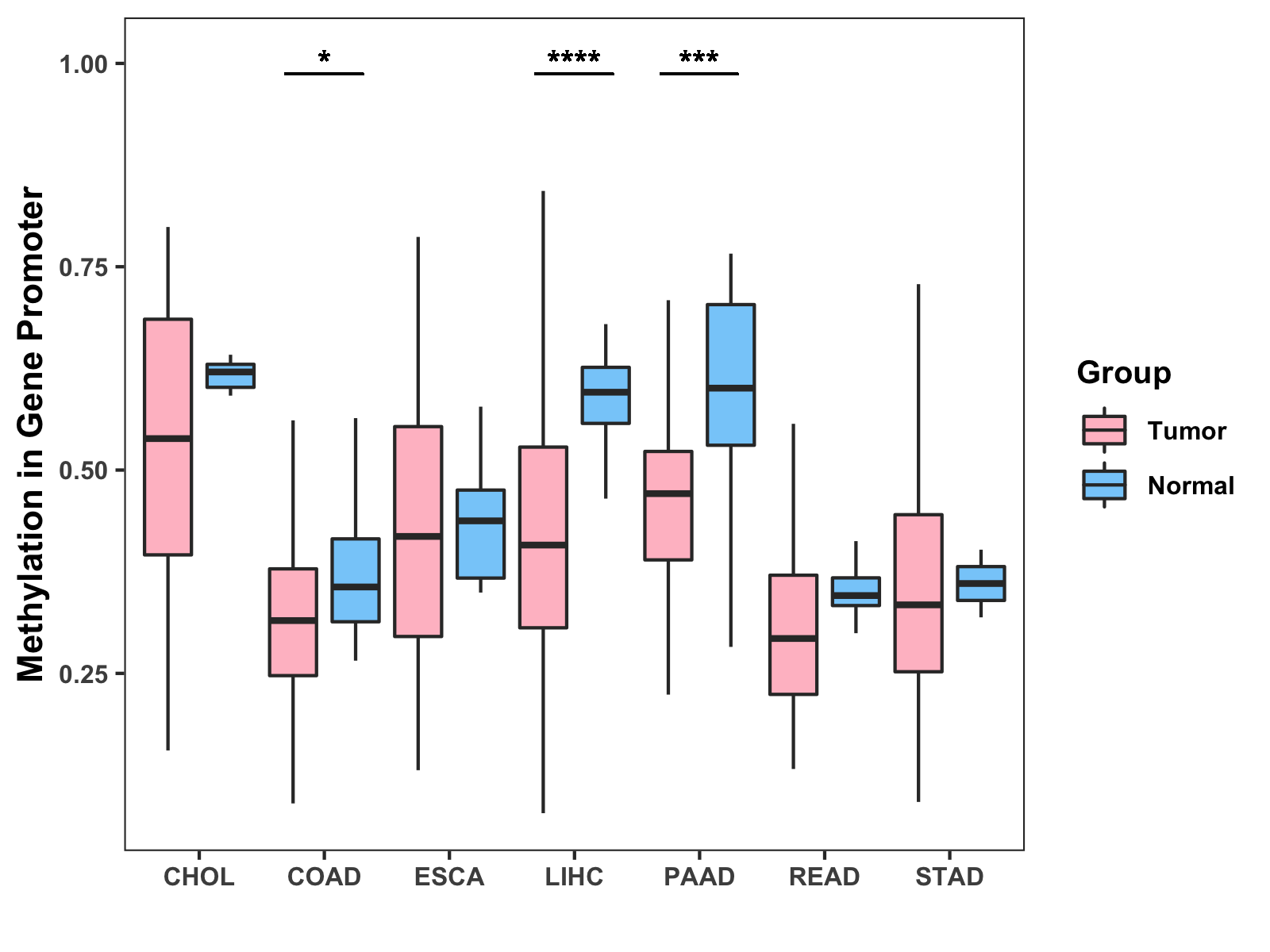 Boxplot of All Gastrointestinal Cancer ( * : 0.01-0.05 , ** : 0.005-0.01 , *** : 0.0001-0.005 , **** : < 0.0001 ) |