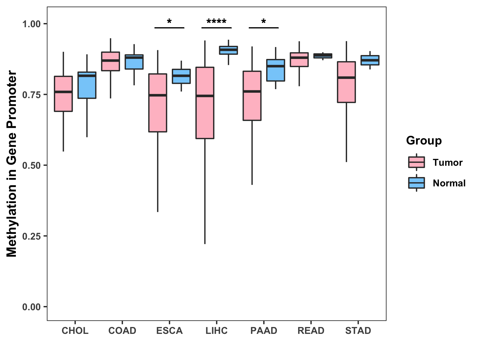 Boxplot of All Gastrointestinal Cancer ( * : 0.01-0.05 , ** : 0.005-0.01 , *** : 0.0001-0.005 , **** : < 0.0001 ) |