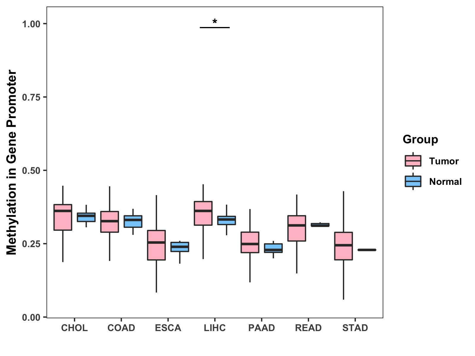 Boxplot of All Gastrointestinal Cancer ( * : 0.01-0.05 , ** : 0.005-0.01 , *** : 0.0001-0.005 , **** : < 0.0001 ) |