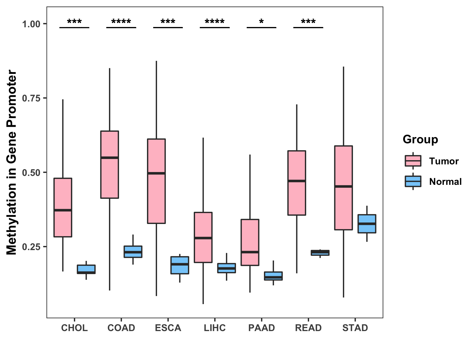Boxplot of All Gastrointestinal Cancer ( * : 0.01-0.05 , ** : 0.005-0.01 , *** : 0.0001-0.005 , **** : < 0.0001 ) |