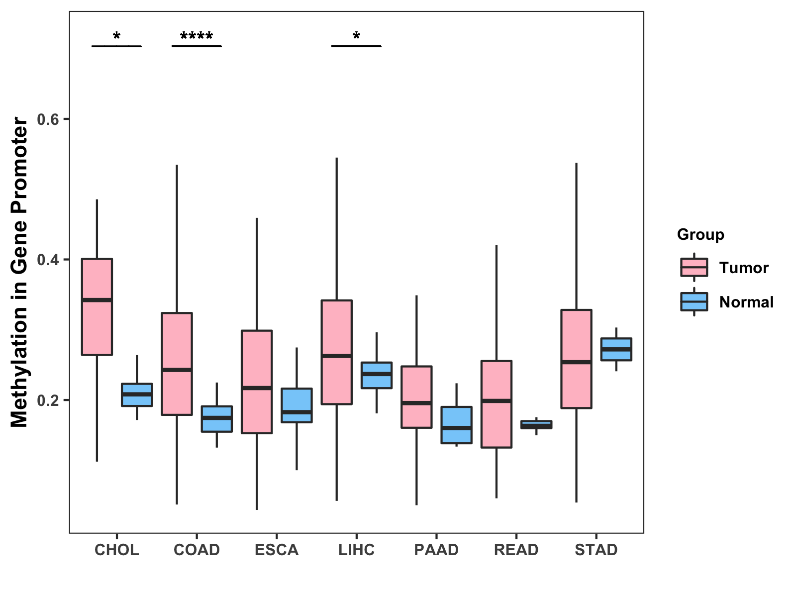 Boxplot of All Gastrointestinal Cancer ( * : 0.01-0.05 , ** : 0.005-0.01 , *** : 0.0001-0.005 , **** : < 0.0001 ) |