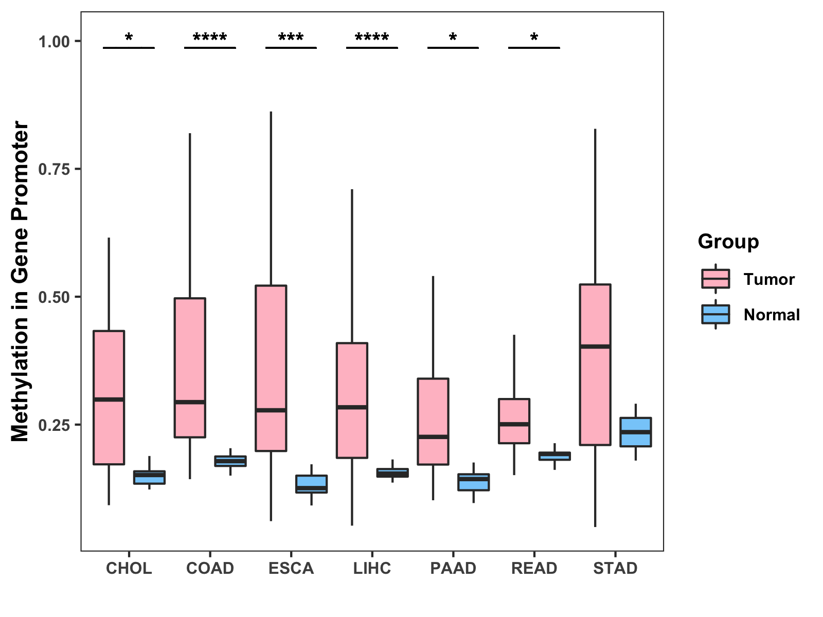 Boxplot of All Gastrointestinal Cancer ( * : 0.01-0.05 , ** : 0.005-0.01 , *** : 0.0001-0.005 , **** : < 0.0001 ) |