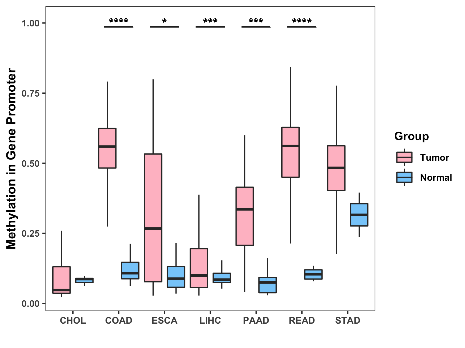 Boxplot of All Gastrointestinal Cancer ( * : 0.01-0.05 , ** : 0.005-0.01 , *** : 0.0001-0.005 , **** : < 0.0001 ) |