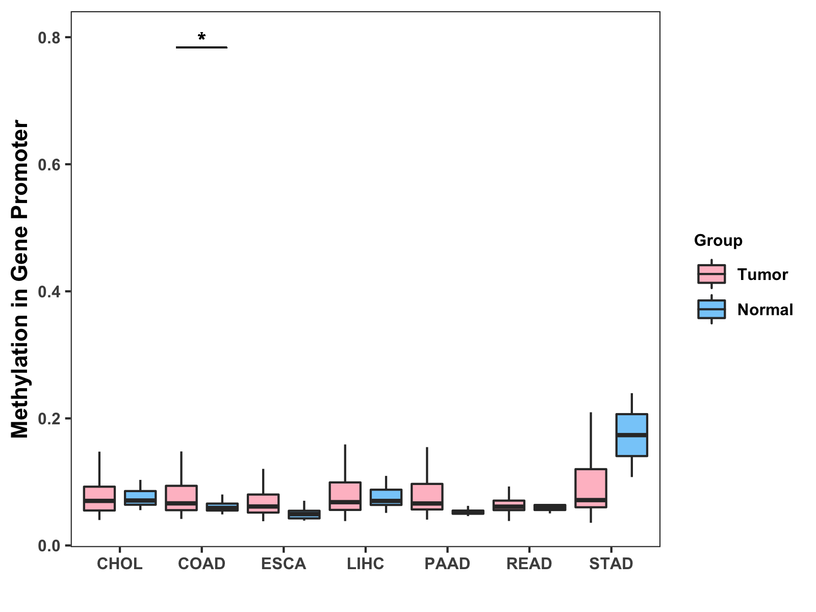 Boxplot of All Gastrointestinal Cancer ( * : 0.01-0.05 , ** : 0.005-0.01 , *** : 0.0001-0.005 , **** : < 0.0001 ) |