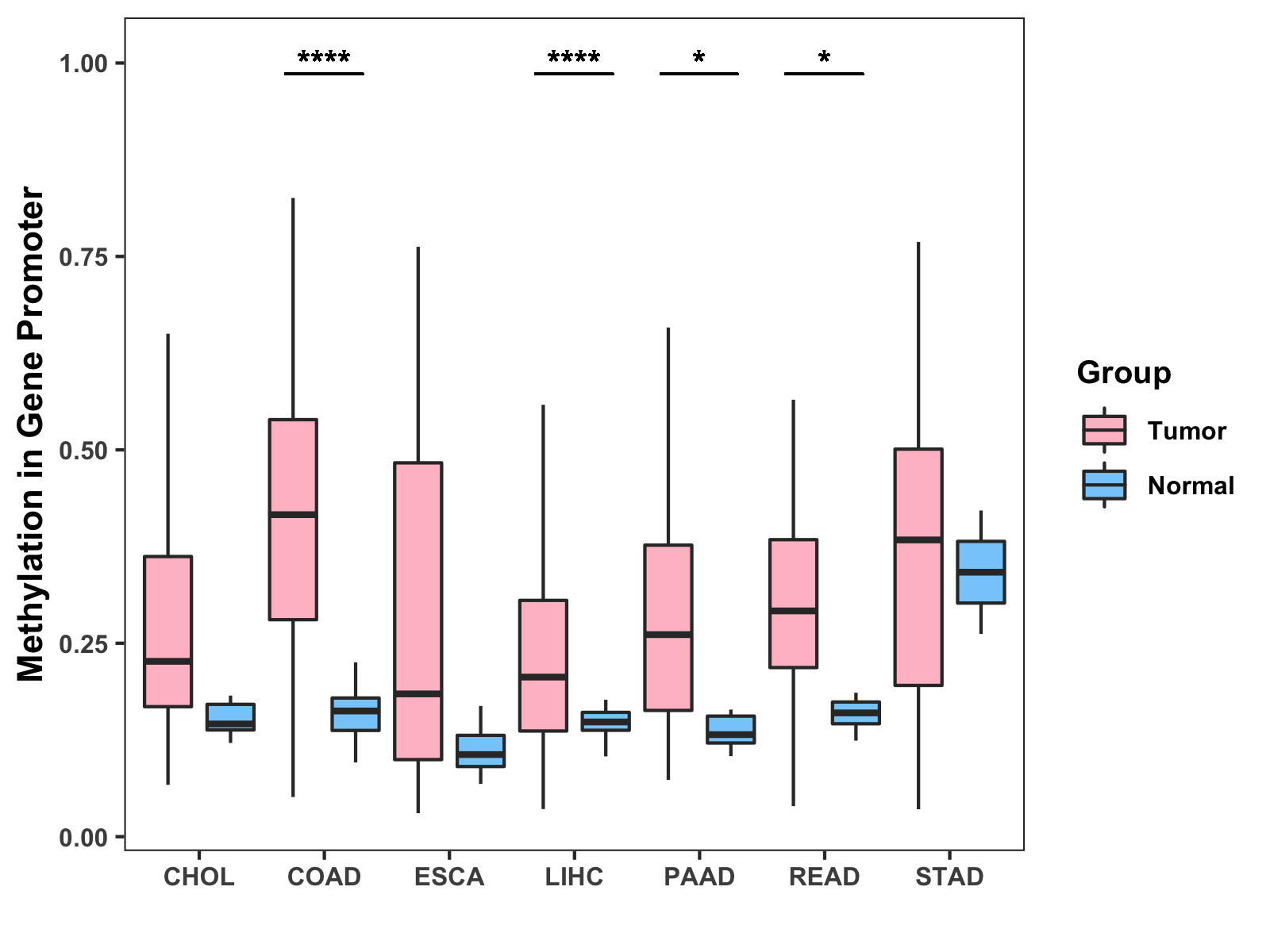 Boxplot of All Gastrointestinal Cancer ( * : 0.01-0.05 , ** : 0.005-0.01 , *** : 0.0001-0.005 , **** : < 0.0001 ) |