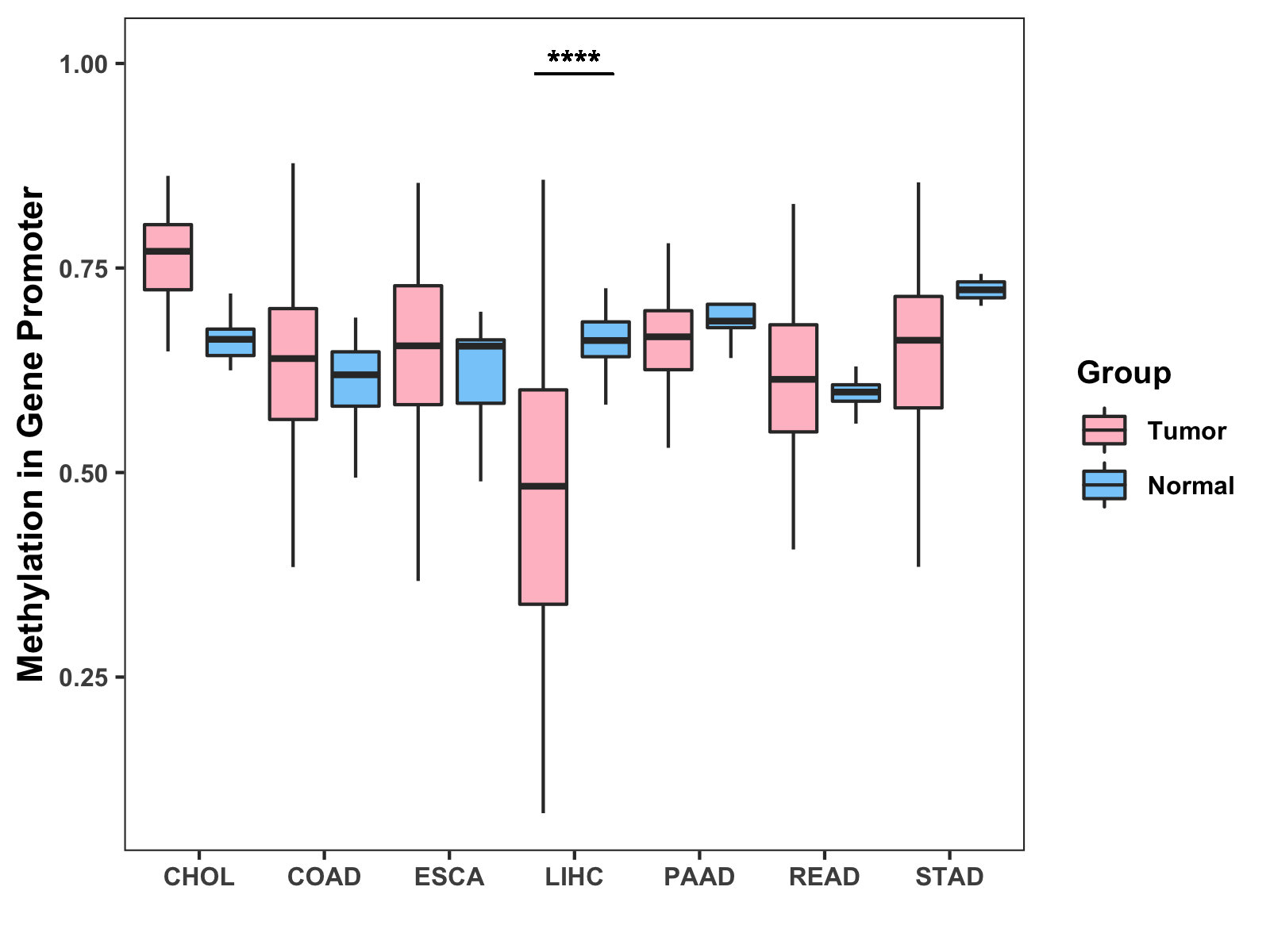 Boxplot of All Gastrointestinal Cancer ( * : 0.01-0.05 , ** : 0.005-0.01 , *** : 0.0001-0.005 , **** : < 0.0001 ) |