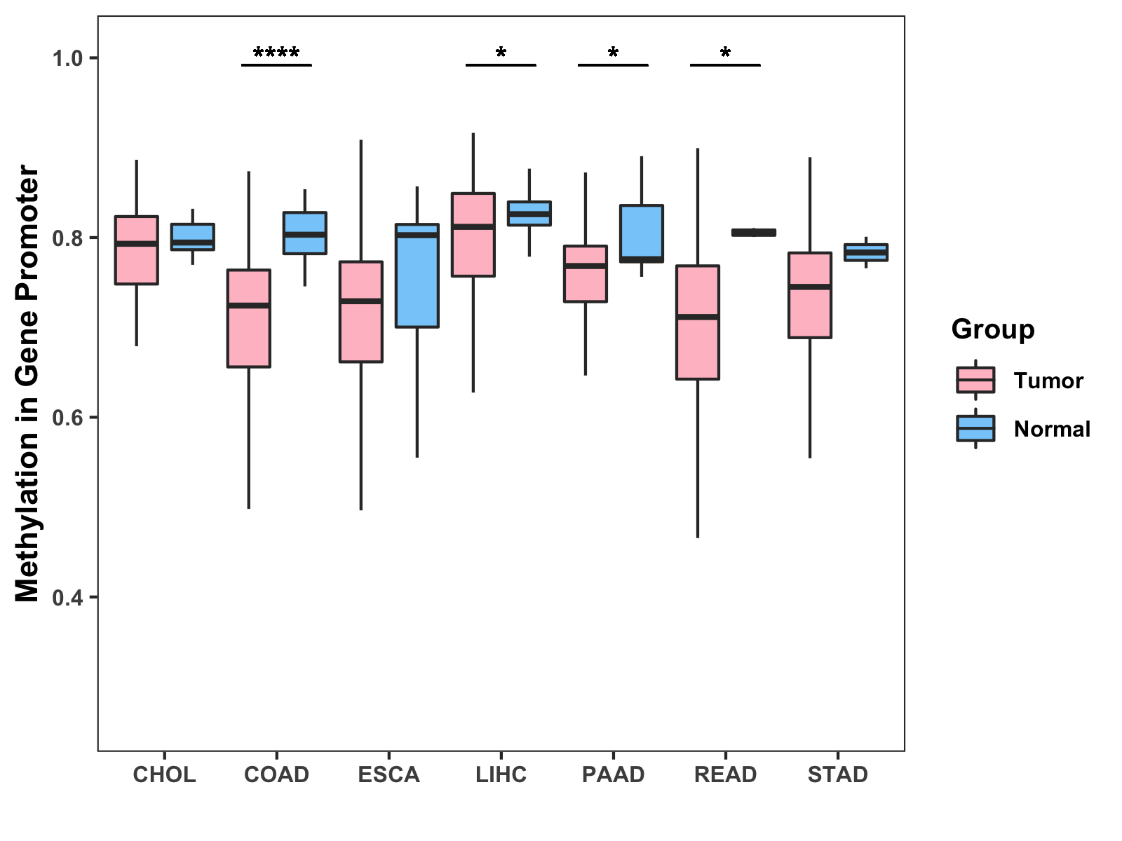 Boxplot of All Gastrointestinal Cancer ( * : 0.01-0.05 , ** : 0.005-0.01 , *** : 0.0001-0.005 , **** : < 0.0001 ) |
