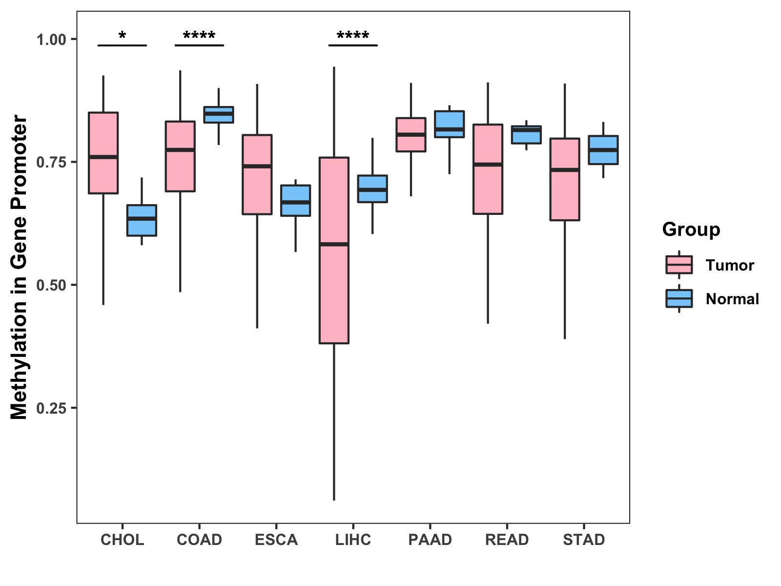 Boxplot of All Gastrointestinal Cancer ( * : 0.01-0.05 , ** : 0.005-0.01 , *** : 0.0001-0.005 , **** : < 0.0001 ) |