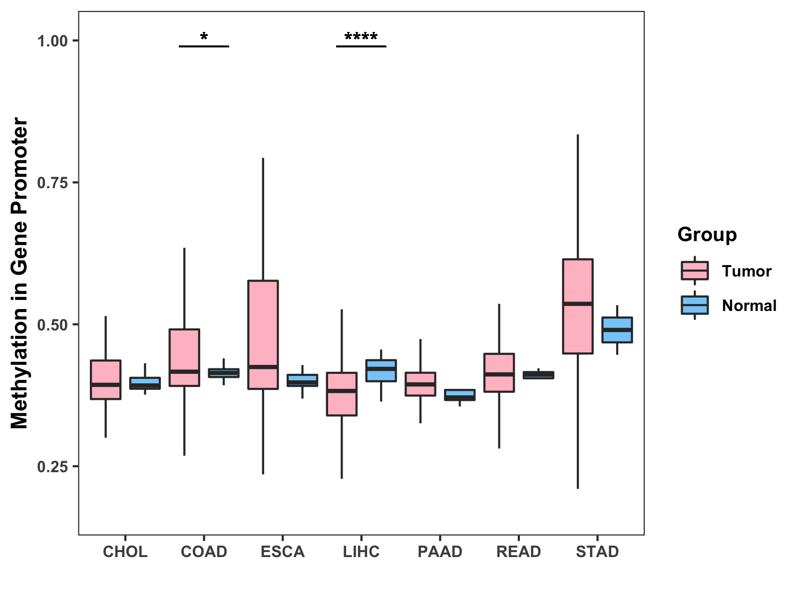 Boxplot of All Gastrointestinal Cancer ( * : 0.01-0.05 , ** : 0.005-0.01 , *** : 0.0001-0.005 , **** : < 0.0001 ) |