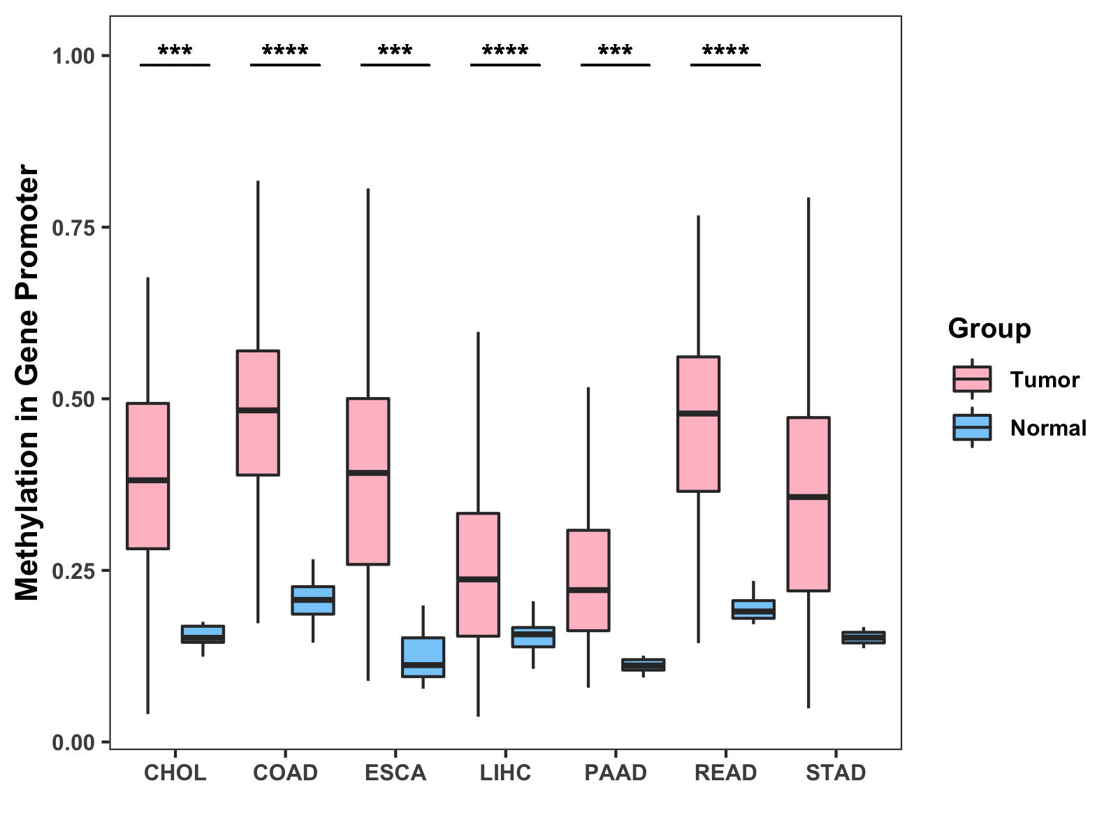 Boxplot of All Gastrointestinal Cancer ( * : 0.01-0.05 , ** : 0.005-0.01 , *** : 0.0001-0.005 , **** : < 0.0001 ) |