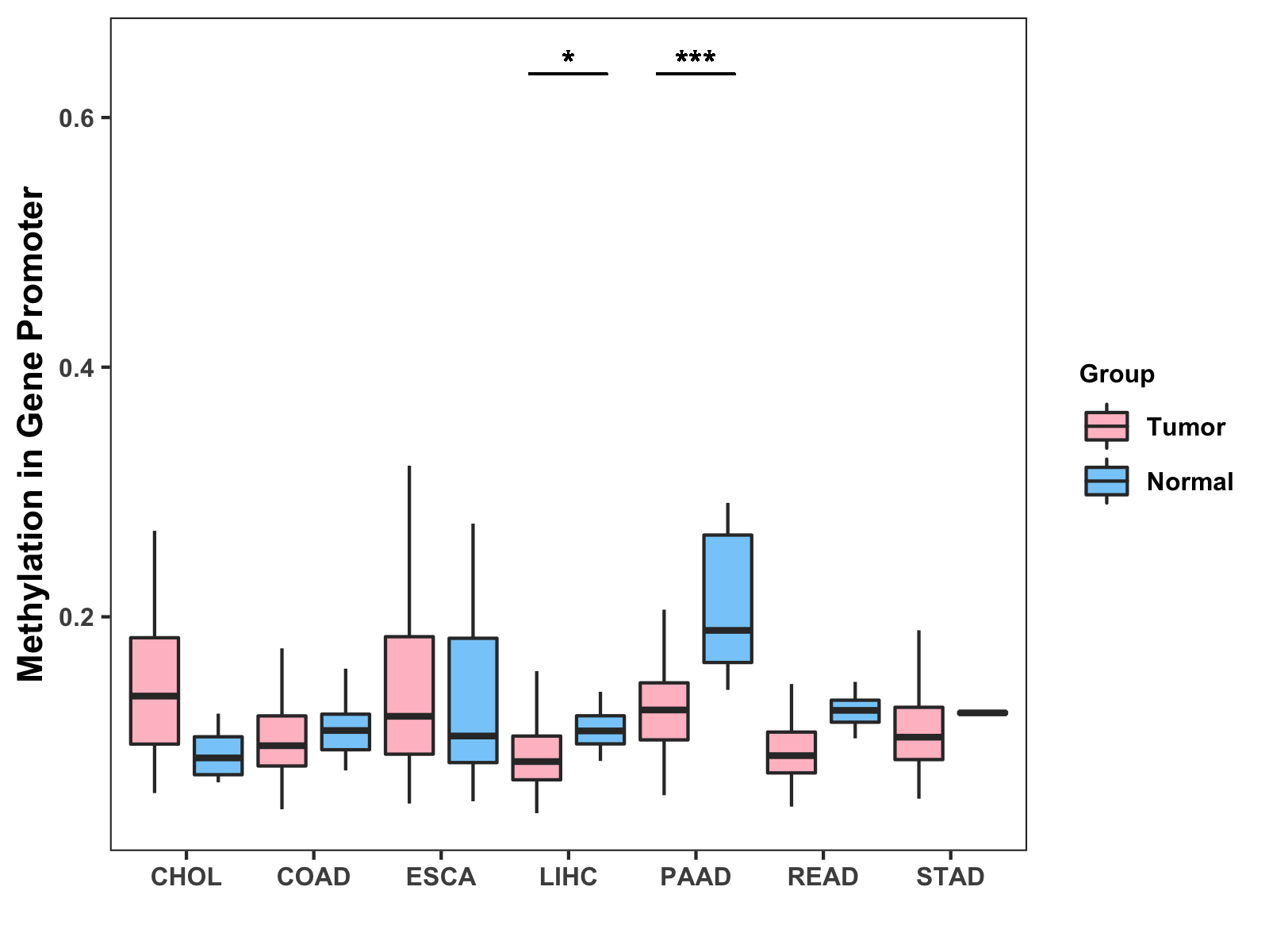Boxplot of All Gastrointestinal Cancer ( * : 0.01-0.05 , ** : 0.005-0.01 , *** : 0.0001-0.005 , **** : < 0.0001 ) |