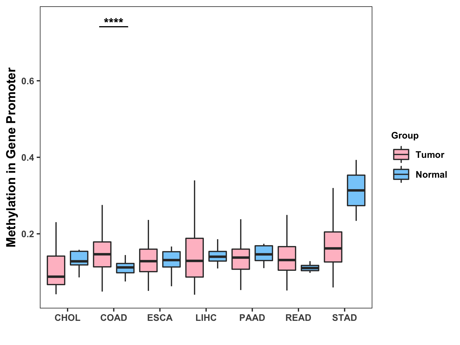 Boxplot of All Gastrointestinal Cancer ( * : 0.01-0.05 , ** : 0.005-0.01 , *** : 0.0001-0.005 , **** : < 0.0001 ) |