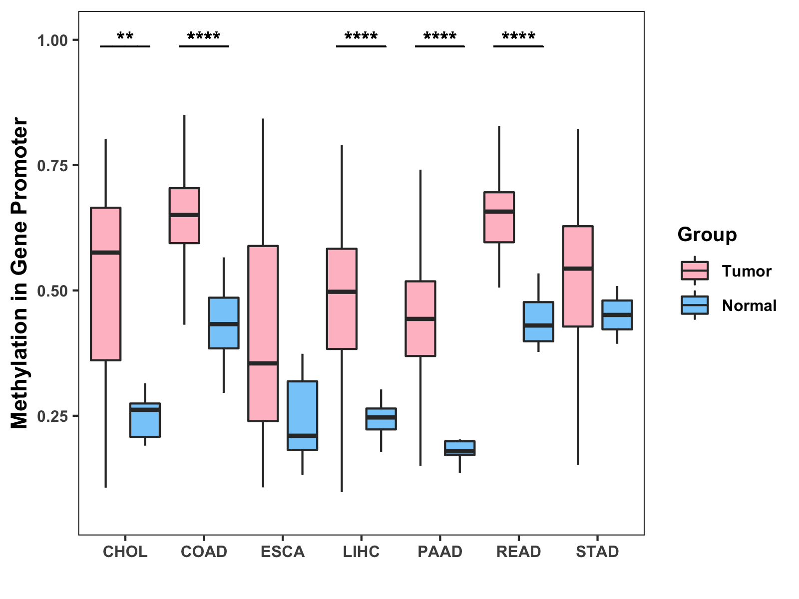 Boxplot of All Gastrointestinal Cancer ( * : 0.01-0.05 , ** : 0.005-0.01 , *** : 0.0001-0.005 , **** : < 0.0001 ) |